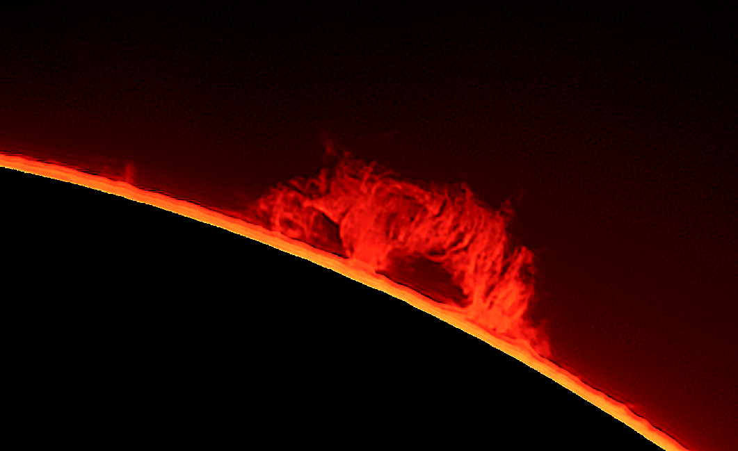 Als "Beifang" zum ISS-Transit kamen dann die Protuberanzen zum Zuge. Bild zwei zeigt die Veränderung der Protuberanz in relativ kurzer Zeit (36 Min.). Bild drei eine Protuberanz auf der Gegenseite der Sonne, die Bilder habe ich des "besseren Schauens" wegen gedreht.