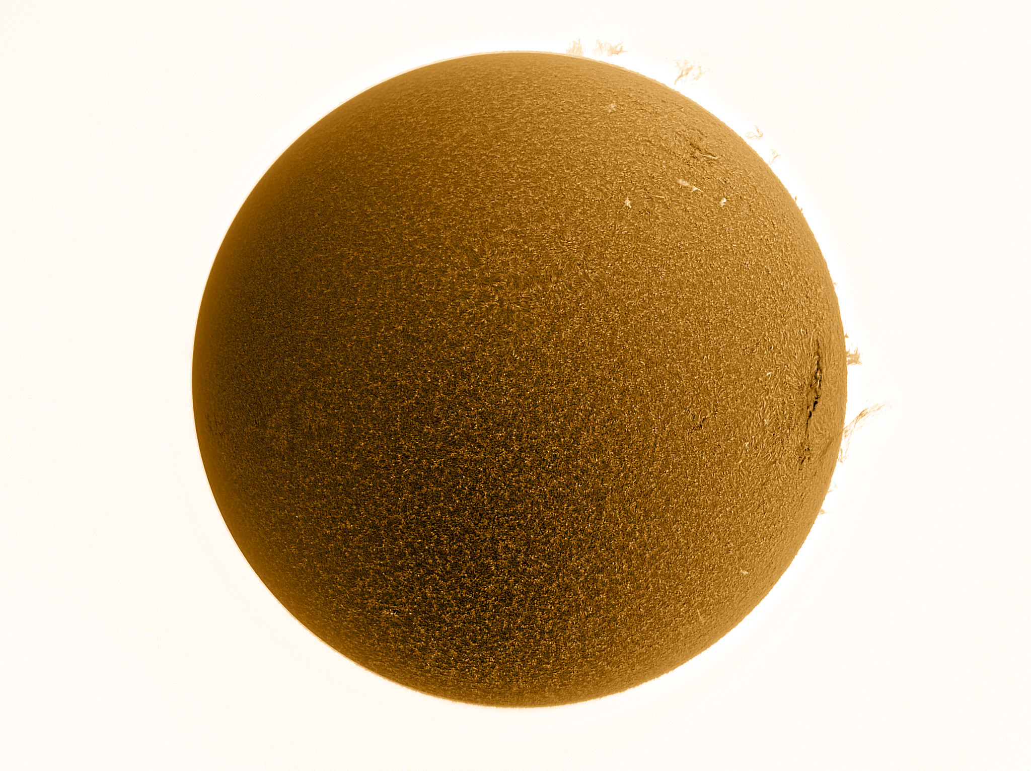 Durch Inversion eines Sonnenbildes (vgl. mein Bild "Protuberanzen mit Filamenten" vom 01.09.2021) können Protuberanzen auf einfach Weise sichbar gemacht werden. Damit entfällt eine lange Belichtungszeit bzw. ein starkes Gaining oder gar das Zusammensetzen von Oberflächenbild und Protuberanzen-Aufnahme.