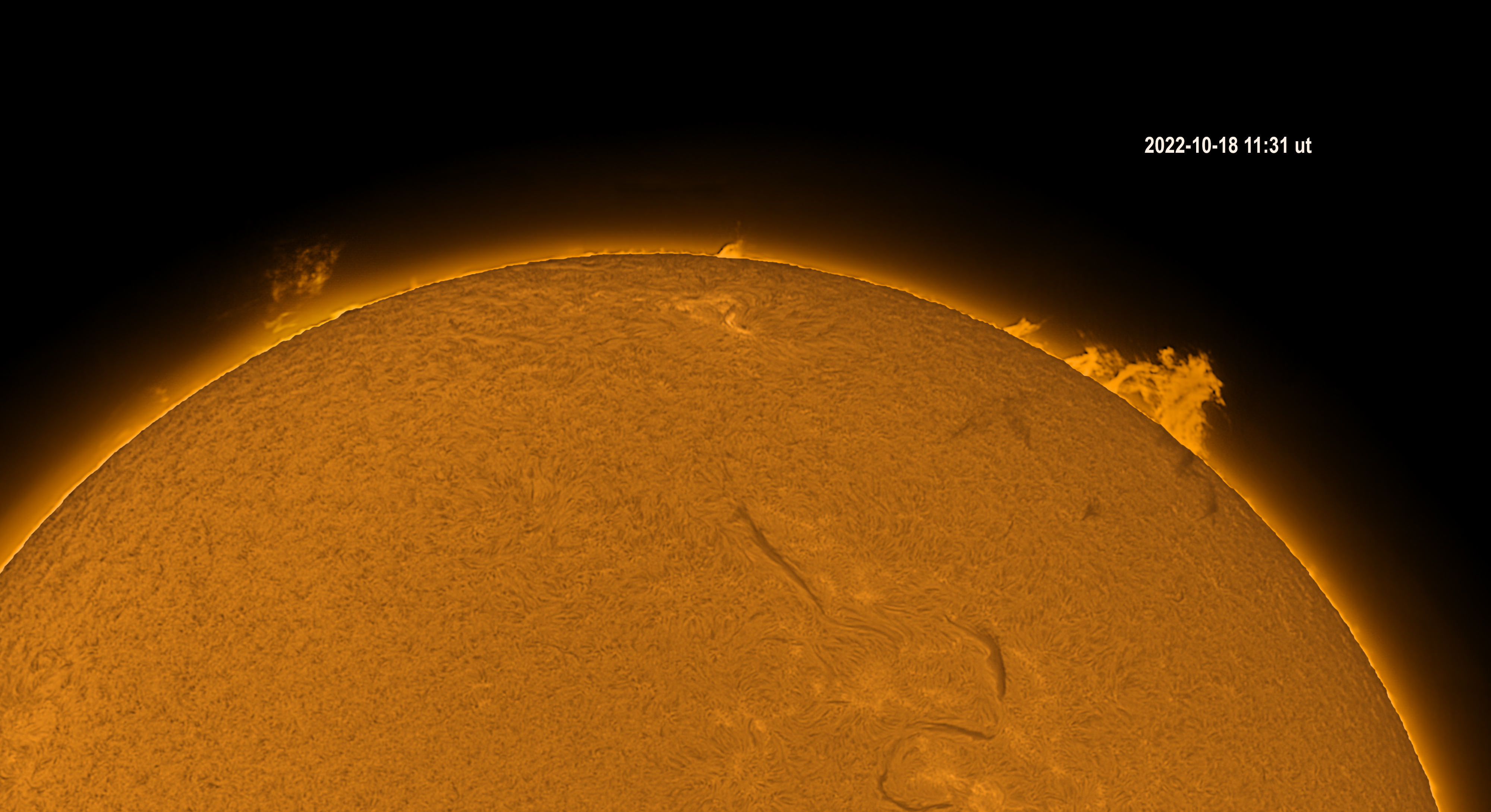 Am 18. Oktober 2022 waren die Sichtverhältnisse besser als tags zuvor. Um die Aktivitäten möglichst sichtbar zu machen, verwendete ich für die Scheibenfläche den Double-Stack Aufsatz zum Lunt 60 x 500 mm. Das Bild besteht deshalb aus 2 Avis, eins für die Scheibenfläche und eins für die Protuberanzen.