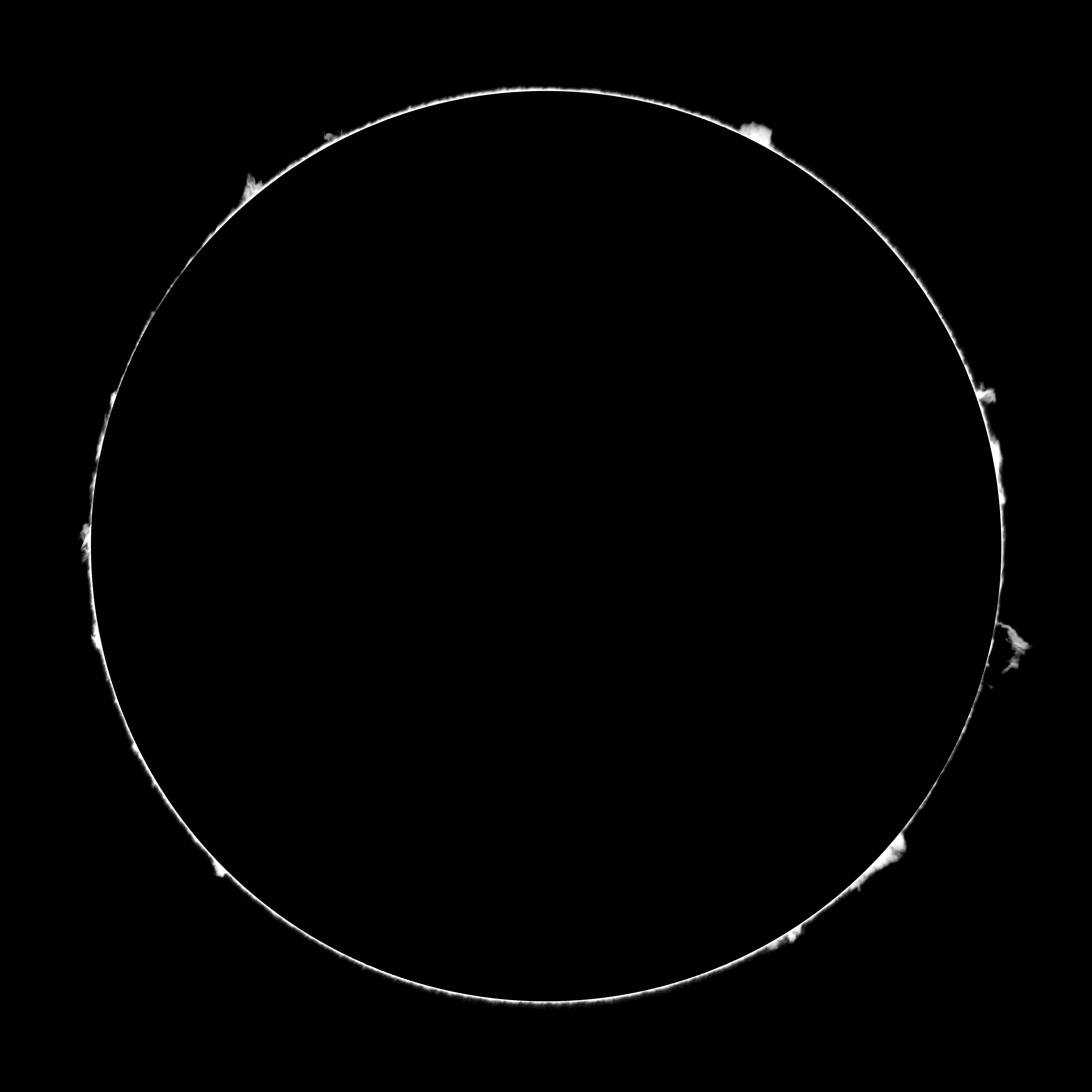 Protuberanzenaufnahme der Sonne in der H-alpha-Linie, aufgenommen mit einem Spektroheliografen bei 630 mm Brennweite. Die Sonnenscheibe wurde ausgeblendet, um die feinen Strukturen der Randprotuberanzen sichtbar hervorzuheben.