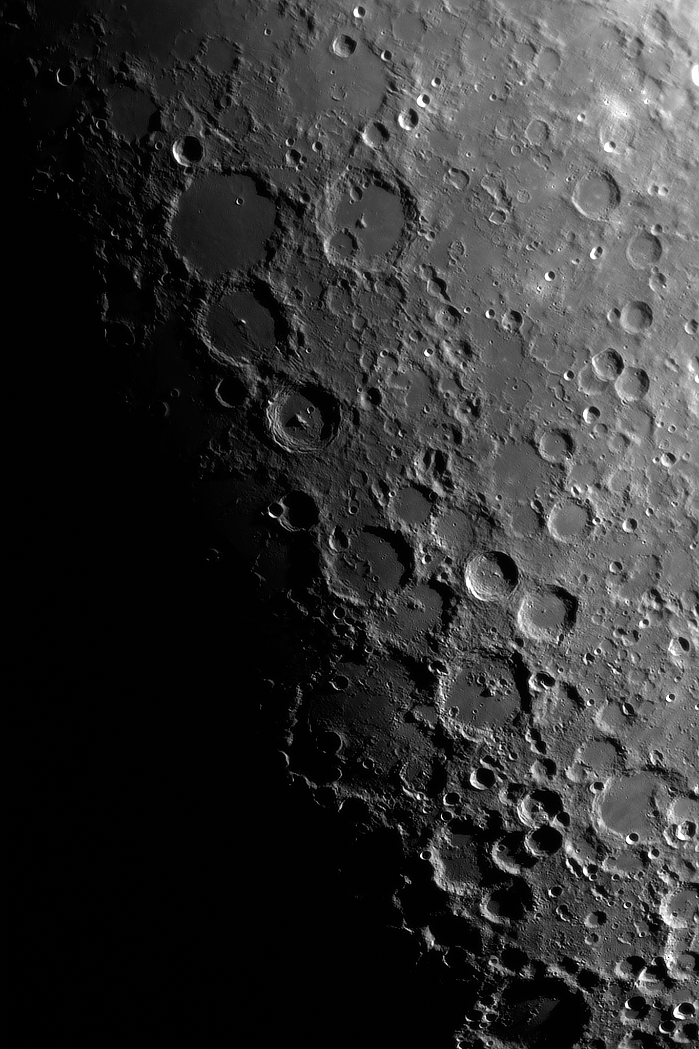 Eine ebenfalls sehr interessante Region auf dem Mond ist die um Ptolemäus, Alphonsus und Arzachel. Der kleine, aber markante Krater im Inneren von Ptolemäus heißt Ammonius und besitzt 9 km Durchmesser. Das Bild reicht bis zum Krater Maginus am unteren Bildrand.