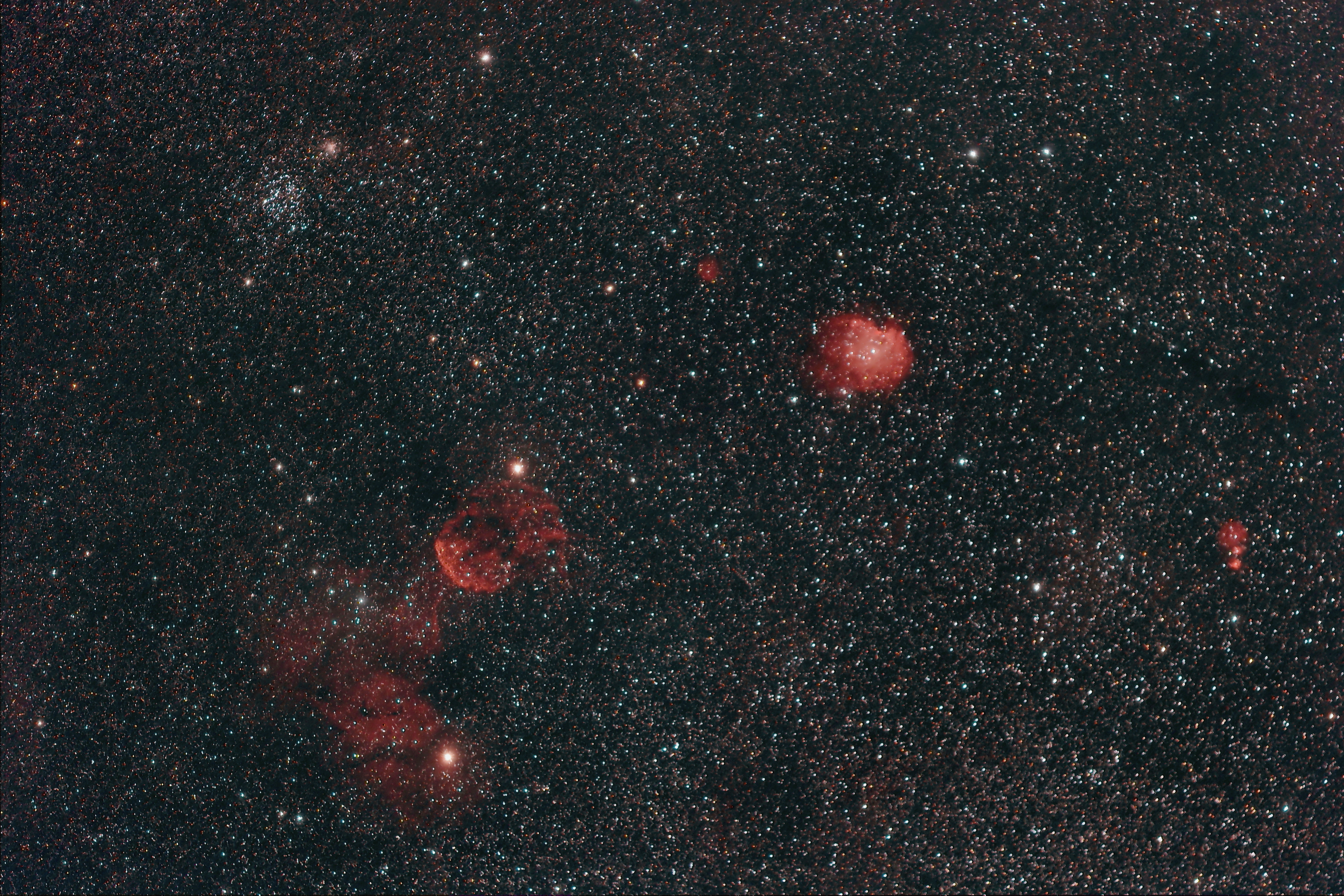 IC 443, der Quallennebel, ist ein Supernova-Überrest, der rund 5000 Lichtjahre von uns entfernt ist. In diesem Bild hat er noch Gesellschaft vom Monkeyhead, dem Affenkopfnebel (NGC 2174), ein Emissionsnebel, der etwa 6400 LIchtjahre entfernt ist. Zudem tummelt sich noch der offene Sternhaufen Messier 35 im Bild, zirka 2800 Lichtjahre entfernt, sowie unmittelbar daneben, der fünfmal so weit entfernte Sternhaufen NGC 2185.