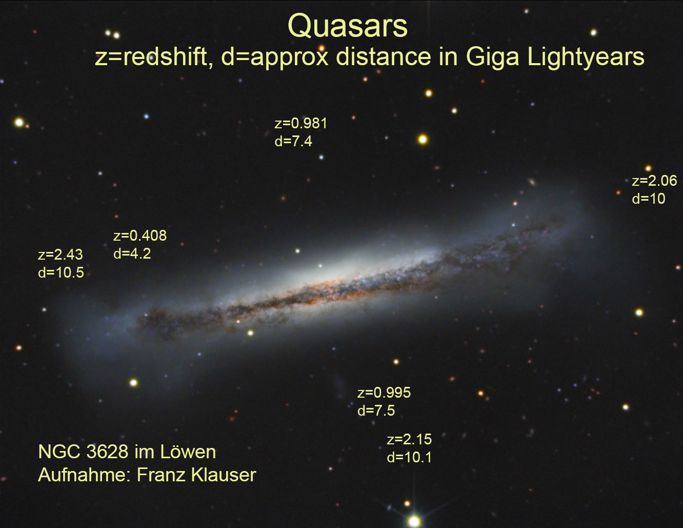 NGC 3628 ist eine Spiralgalaxie vom Hubble-Typ Sc pec, ist rund 30 Millionen Lichtjahre entfernt und hat einen Durchmesser von etwa 120000 Lichtjahren. Wir sehen die Galaxie in Kantenstellung, die Spiralarme erscheinen als dunkle staubhaltige Wolken, beleuchtet vom hellen Zentrum der Galaxie. Rund um die Galaxie konnte ich einige Quasare lokalisieren, die hier als sternähnliche blaue Punkte erkennbar sind. Sie sind einige Milliarden Lichtjahre entfernt.