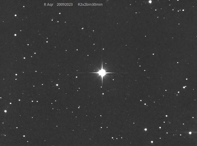 Im September 2023, fast genau drei Jahre nach meiner Aufnahme, wollte ich noch einmal eine Anzahl von Photonen sammeln, um das alte Bild weiter upzudaten. Diesmal begann ich eine Probeaufnahme mit 2x2-Binning in Rot und was ich da sah, zeigt dieses Bild: ein heller Stern ohne jeglichen Nebel beiderseits! Ich war völlig perplex und brach mein weiteres Vorhaben ab, da mir klar wurde, dass der Stern den umgebenden Nebel völlig überstrahlte!
