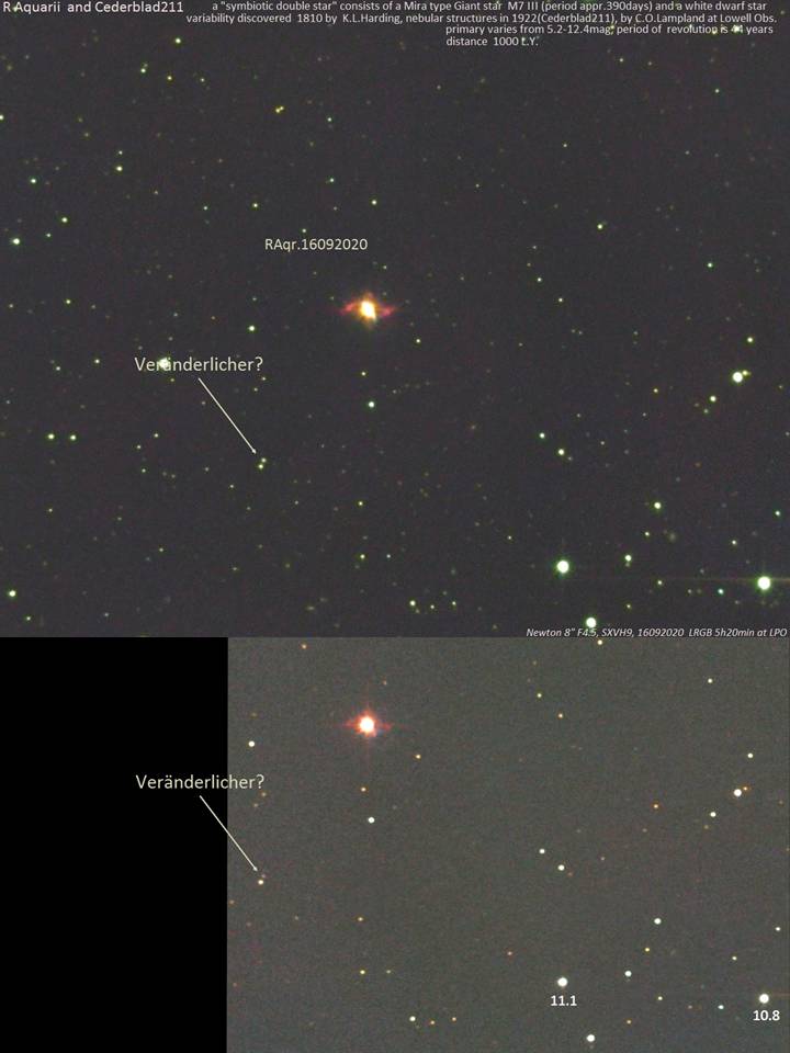 Zum Abschluss der Vergleich der Aufnahmen von September 2020 und Dezember 2023. Es war schön, diesen Helligkeitsausbruch des kataklysmischen Veränderlichen R Aqr miterleben zu können und ihn dokumentiert zu haben. Als Nebenprodukt sieht man südöstlich einen Veränderlichen Stern, den ich aber trotz Recherchen nicht identifizieren konnte.