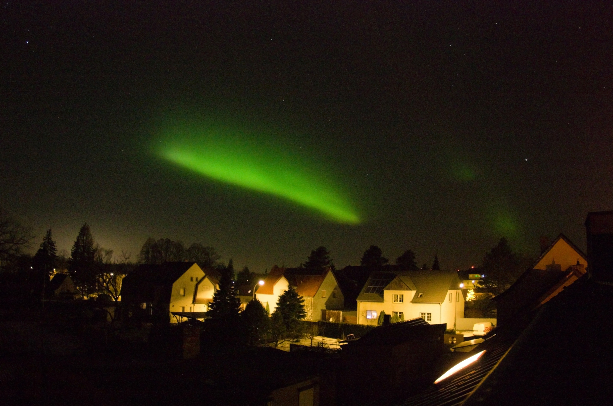 Glücklicherweise wurde ich noch rechtzeitig von meinem Nachbarn per Telefon über das Polarlicht informiert. Im Norden ein vergleichsweise ruhiger grün-roter Bogen, doch von Ost nach West und bis in den Südhimmel pulsierten grüne Flecken im Sekundentakt.