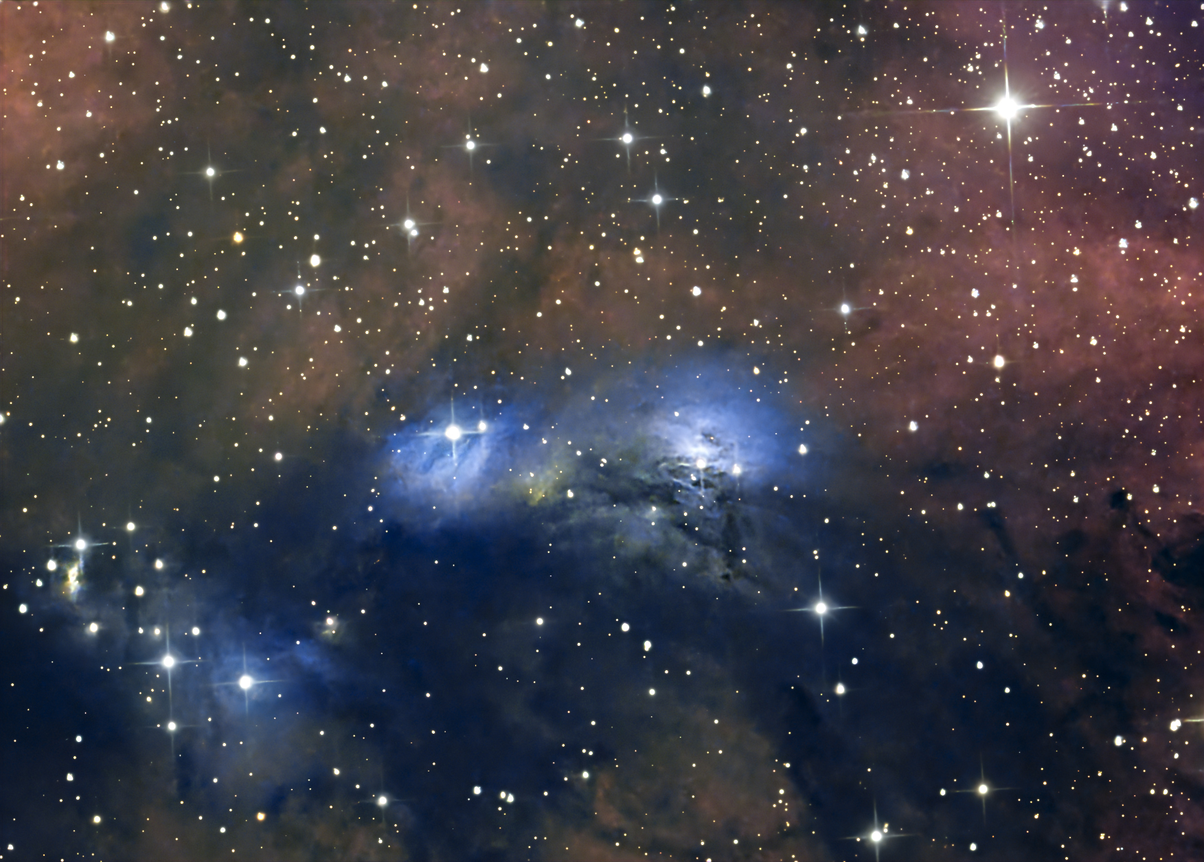 In einer Entfernung von 6000 Lichtjahren befinden sich im Sternbild Schwan die Reflexionsnebel NGC 6914 (links), vdB 132 (in der Mitte) und vdB 131 (rechts), deren Staubwolken das blaue Licht der in die Nebel eingebetteten Sterne reflektiert. Umgeben werden die drei Bereiche von Wasserstoffwolken, die ihrerseits durch die ultraviolette Strahlung junger Sterne ionisiert werden.