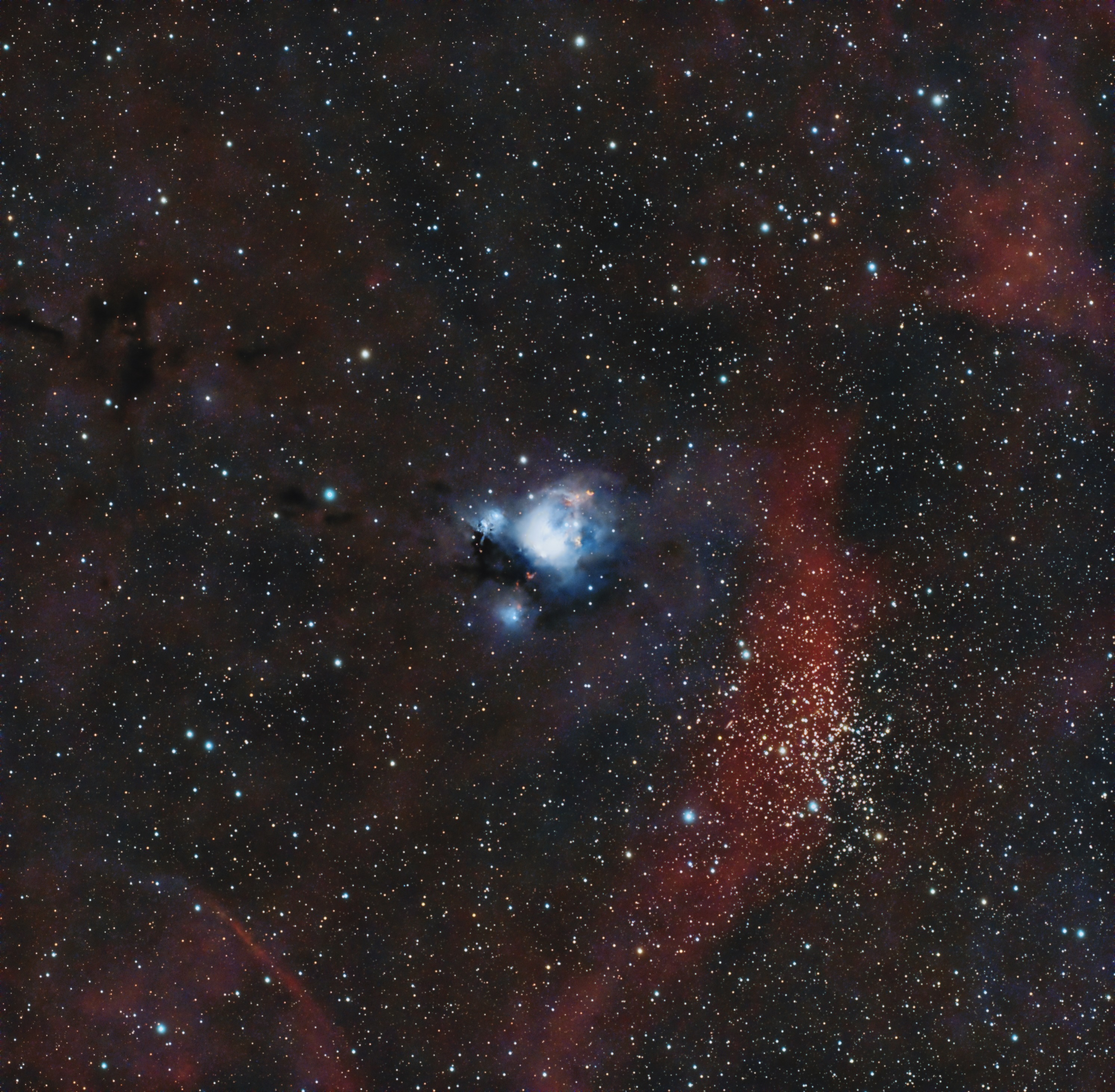 Eine Weitfeldaufnahme des Reflexionsnebels NGC 7129 und des offenen Sternhaufens NGC 7142 im Sternbild Kepheus am Nordsternhimmel. Der Nebel ist mit einer Entfernung von ca. 3000 Lichtjahren halb so weit entfernt wie der Sternhaufen mit 6000 Lichtjahren. Ebenfalls sichtbar sind die rot leuchtenden Wasserstoffregionen.