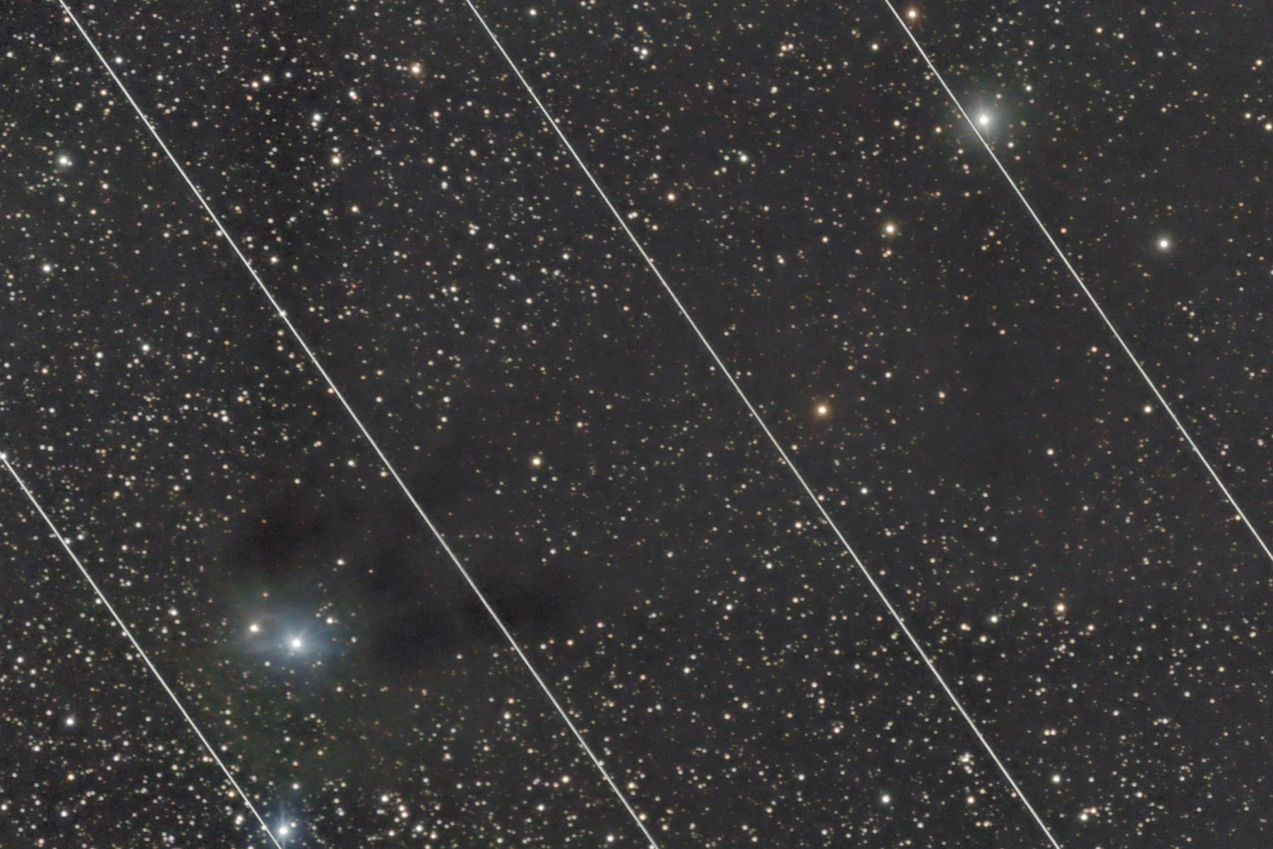 Am 15. März 2020 peilte ich den Reflexionsnebel vdB 31 mit den daneben liegenden Dunkelwolken B26 bis B28 an. Das Ziel lag im Fuhrmann nahe zur Grenze zum Stier. Gespannt wartete ich am Laptop auf die erste herunter geladene Vier-Minuten-Aufnahme. Und war schockiert: ich sah ein gleichmäßiges Streifenmuster. Mein Blick zum Himmel bestätigte meine Annahme. Wie auf einer Perlenschnur aufgereiht folgten noch mehrere Störenfriede hintereinander, die Gottseidank alle mein Bildfeld verfehlten. Wie ich später recherchierte, waren es Starlinks aus der zweiten Serie, gestartet am 7. Januar 2020. Mein Bild zeigt eine Auswertung aller 25 Aufnahmen (von 20:10 bis 22:00 Uhr MEZ) mit Maximum-Funktion, mit dabei diese erste Aufnahme von 20:10 bis 20:14 Uhr MEZ.