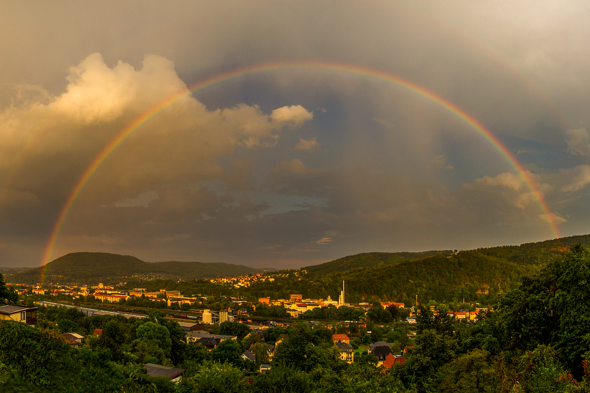 Wechselhaftes Schauerwetter bietet oft wunderschöne Wettererscheinungen. So wie hier am Abend des 20. August 2023, als sich dieser prachtvolle Regenbogen über Freital in Sachsen erhob. Schwach der Nebenregenbogen darüber. Zuvor gab es ein hübsches Gewitter. Rechts Fallstreifen ausfallenden Niederschlags.