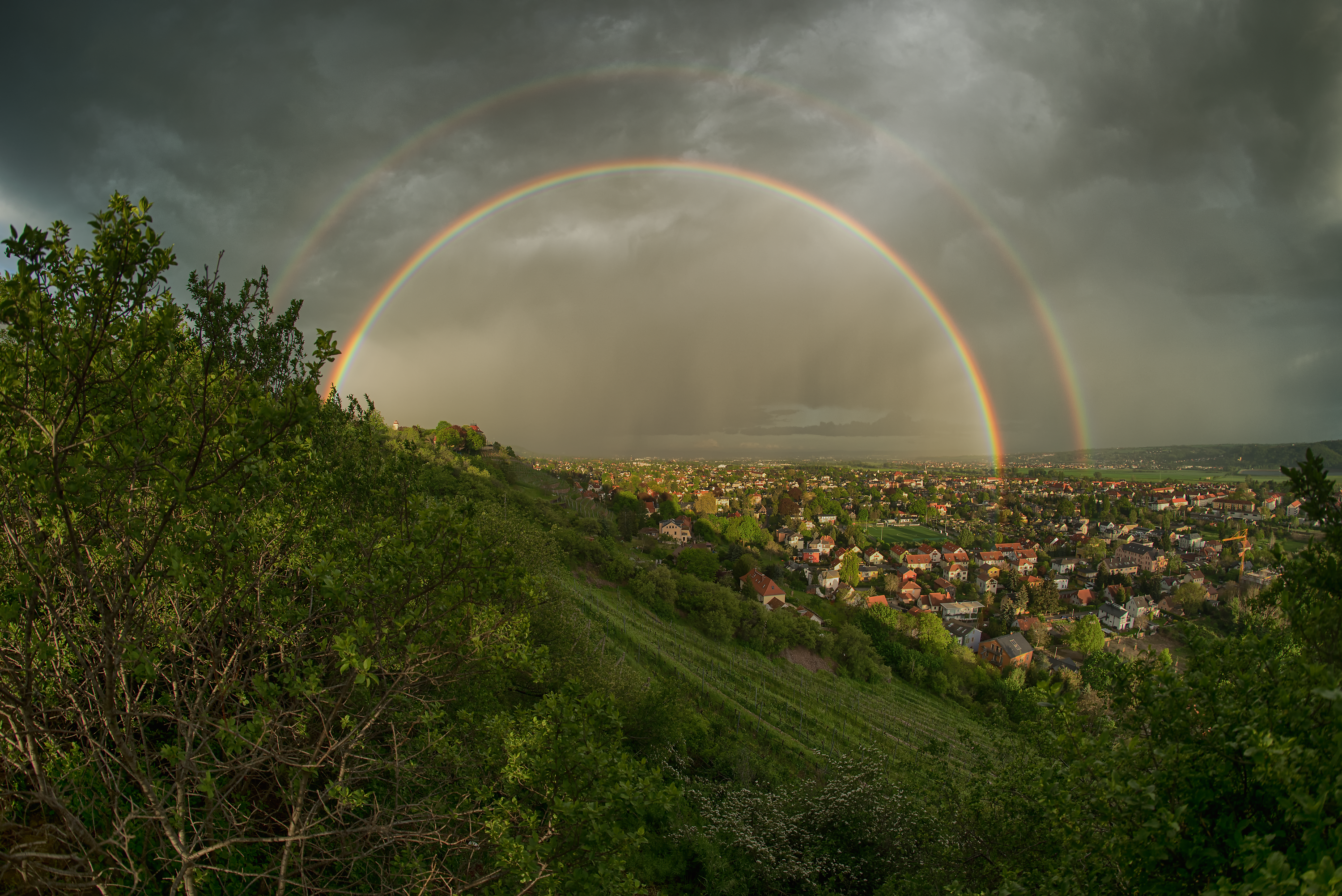 Beim dem Durchzug einer kleinen Schauerzelle spannte sich am Abend des 16. Mai gegen 20 Uhr ein herrlicher Regenbogen über Radebeul. Erste Ordnung (primärer Bogen) und zweite Ordnung (sekundärer Bogen, in umgekehrter Farbreihenfolge) waren perfekt ausgebildet.