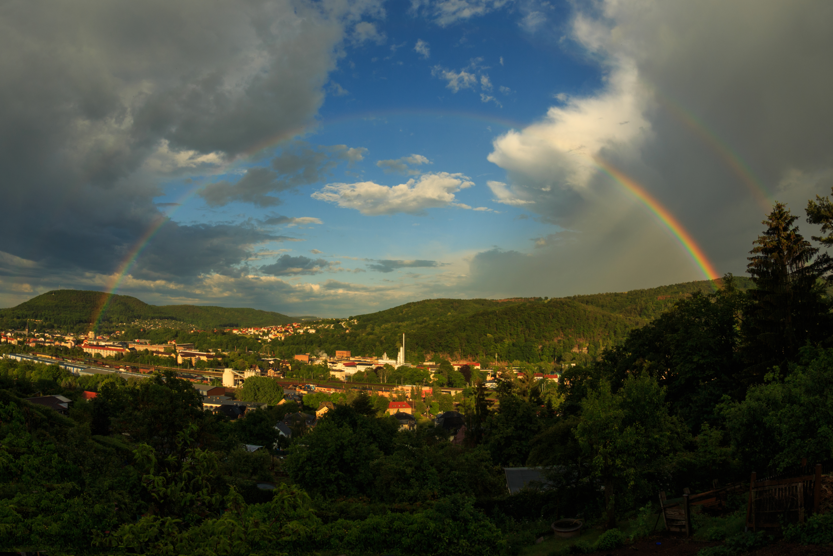Am Nachmittag und Abend des 2. Juni 2020 bildeten sich überraschend über Sachsen (Raum Freital/Dresden) sehr eindrucksvolle Gewitter und starke Schauer, die von Norden (!) hereinzogen. Zwischendurch kam die Sonne heraus und es bildete sich zwischen zwei Gewitterzellen dieser eindrucksvolle Regenbogen, der Freital wie ein Tor überspannt. Perfekt war auch die Lichtstimmung …