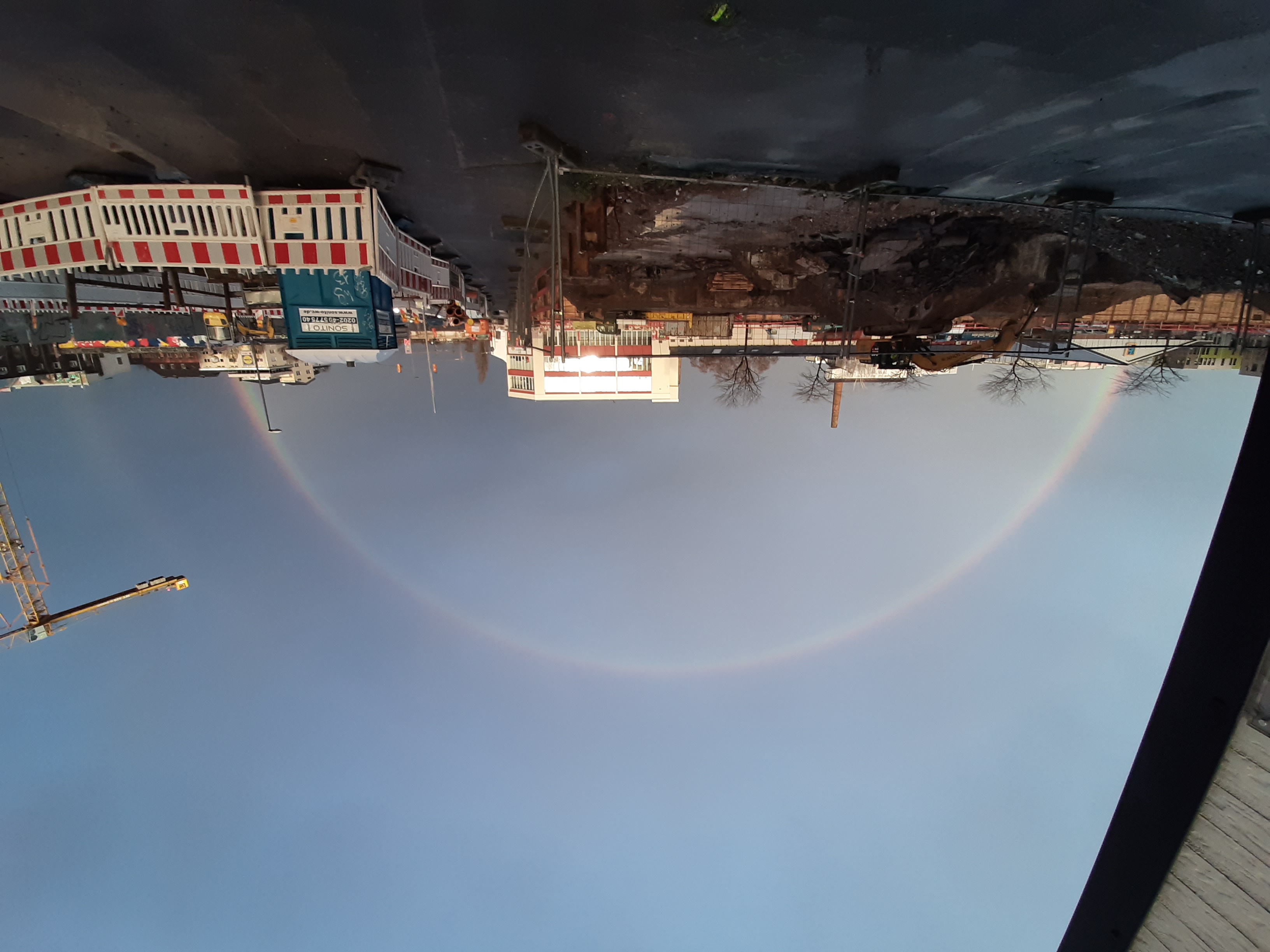 Am 10. Februar 2020 musste ich trotz Sturms wegen eines Termins unterwegs sein. Von Osten klarte es auf, und die Sonne erzeugte einen prächtigen doppelten Regenbogen gegen die dunkle Wolkenwand im Westen. Der Bogen war komplett. Leider hatte ich nur ein Smartphone bei mir, aber dank des Superweitwinkels war es möglich, den kompletten Regenbogen abzubilden.