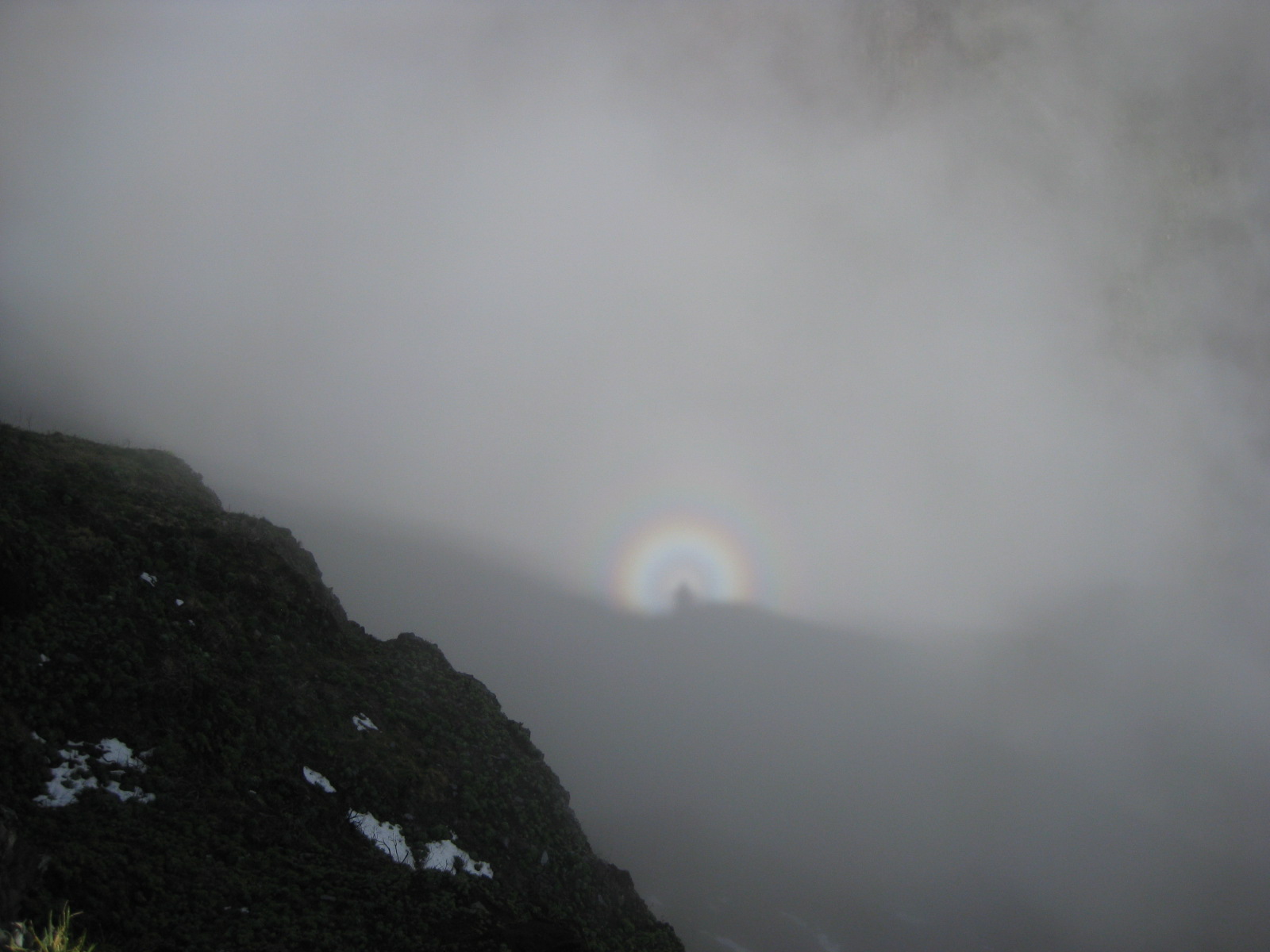 (Anmerkung der Redaktion: Die auf dem Bild zu sehenden optischen Effekte heißen Brockengespenst und Glorie. Siehe http://de.wikipedia.org/wiki/Brockengespenst und http://de.wikipedia.org/wiki/Glorie)