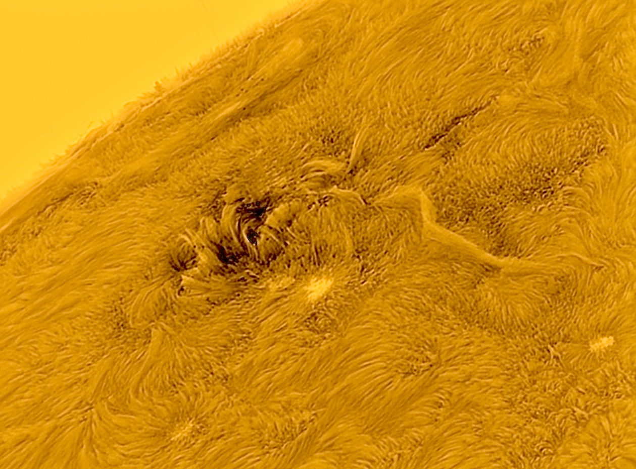 Die Aufnahme vom 25. August 2025 zeigt den Sonnenrand in der Region von AR 4197. Die invertierte S/W-Aufnahme wurde anschließend coloriert.