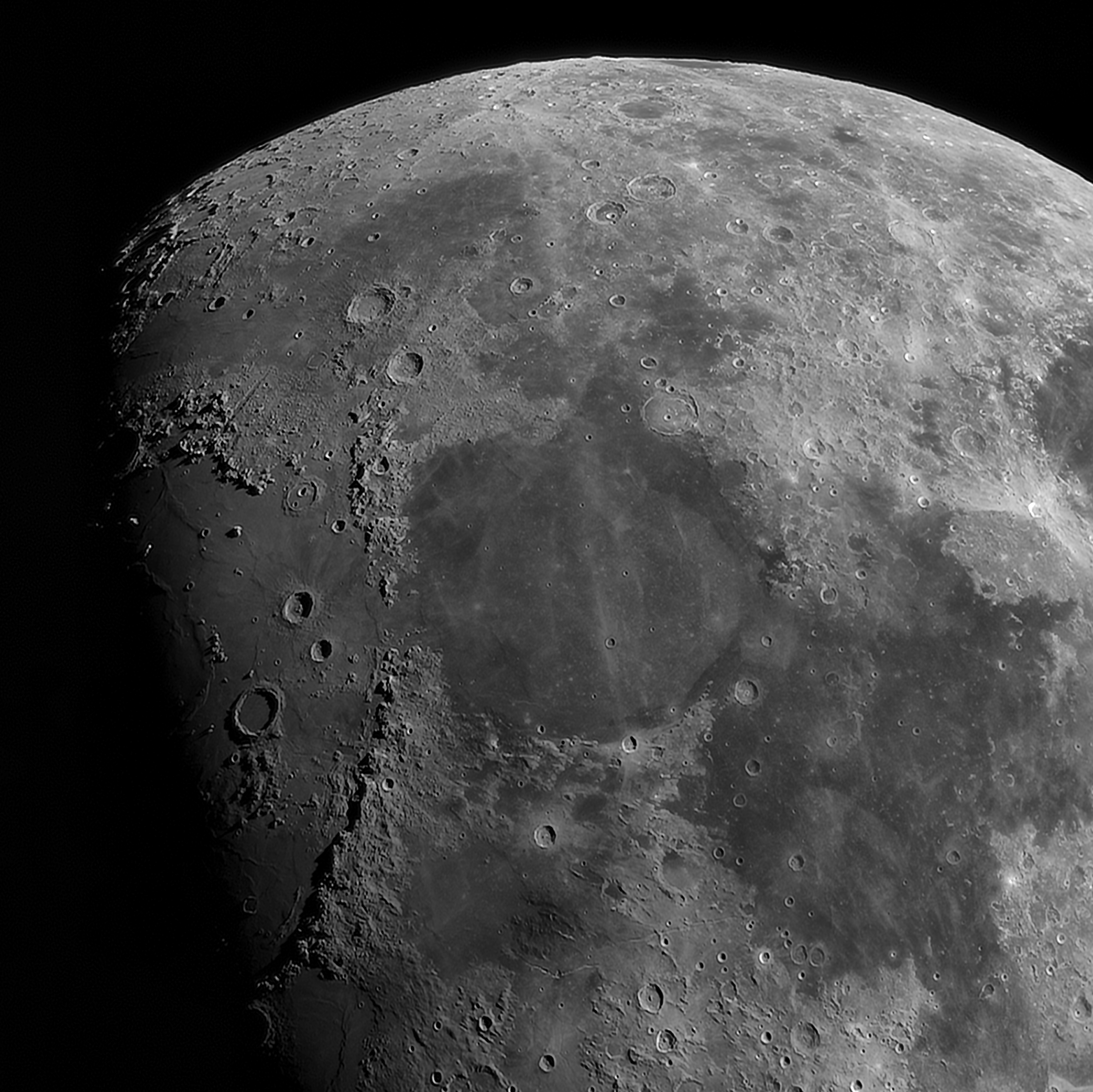 Einzelbild aus Mondmosaik, erstellt aus PNG-Video 1000 Frames. In Autostakkert 25% zu PNG-Summenbild gestackt. Klare Sicht, ruhige Luft.