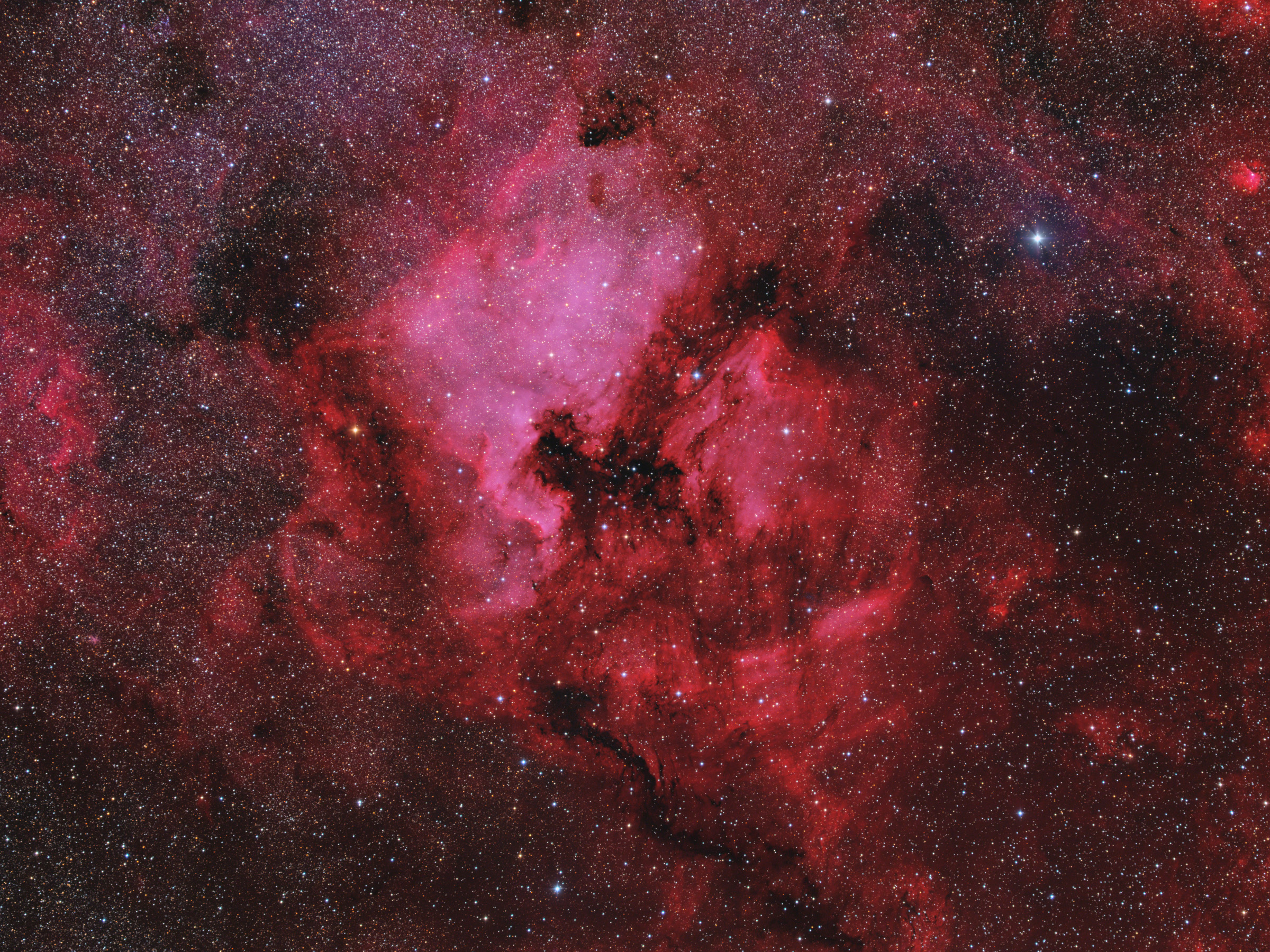 Die Region um den Nordamerikanebel (NGC 7000) und den Pelikannebel (IC 5070) ist als Klassiker am Sommerhimmel hinreichend bekannt und es bedarf von daher keiner weiteren Objektbeschreibung. Eigentlich bin ich als Deep-Sky-Fotograf mit langer Brennweite unterwegs, doch ich wollte diese Region einmal als so genanntes »Widefield« aufnehmen. Zum Einsatz kam dafür meine CCD-Kamera QSI583ws, bestückt mit dem Samyang 2,0/135 mm, getragen von meiner recht betagten Vixen-Reisemontierung. Nachdem die Polausrichtung erfolgreich abgeschlossen war, habe ich jeweils eine Sequenz von L-, RGB- und H-Alpha-Aufnahmen durchlaufen lassen. Bei sorgfältiger Aufstellung sind mit diesem Equipment 300s-Subframes freilaufend ohne Guiding problemlos möglich, sodass ich mich während der gesamten Aufnahmedauer nicht mehr darum kümmern musste und zwischenzeitlich andere Dinge erledigen konnte. Bei der Einarbeitung der H-Alpha-Daten habe ich versucht, die Farbbalance des photometrisch kalibrierten RGB-Bilds nicht wesentlich zu verändern, doch aufgrund des sehr starken H-Alpha-Signals ist zwangsläufig die Farbe Rot sehr dominant geworden.