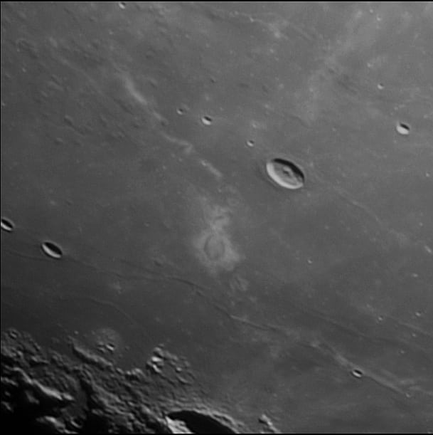 Am 14.3.2014 machte ich dieses Bild einer ganz besonderen Struktur auf dem Mond. Diese Struktur wird Reiner Gamma genannt. Es sieht aus, als würden sich helle Schlieren in einer Flüssigkeit bewegen. Es handelt sich hier nicht um Flüssigkeit, :-) einen Krater oder vulkanische Struktur die einfach nur "komisch" ausschaut. An dieser Stelle ist das Gebiet flach. Es gibt dort keine Erhebungen. Lange Zeit gab diese Struktur Rätsel auf, da sich niemand dieses Phänomen erklären konnte. Heute wissen wir, dass es an dieser Stelle Magnetfelder gibt, die hier die Mondoberfläche vor dem Altern durch den Sonnenwind schützen. Reiner Gamma ist die einzige derartige Stelle an der für uns sichtbaren Mondseite. Die anderen Stellen befinden sich alle auf der Rückseite des Mondes.