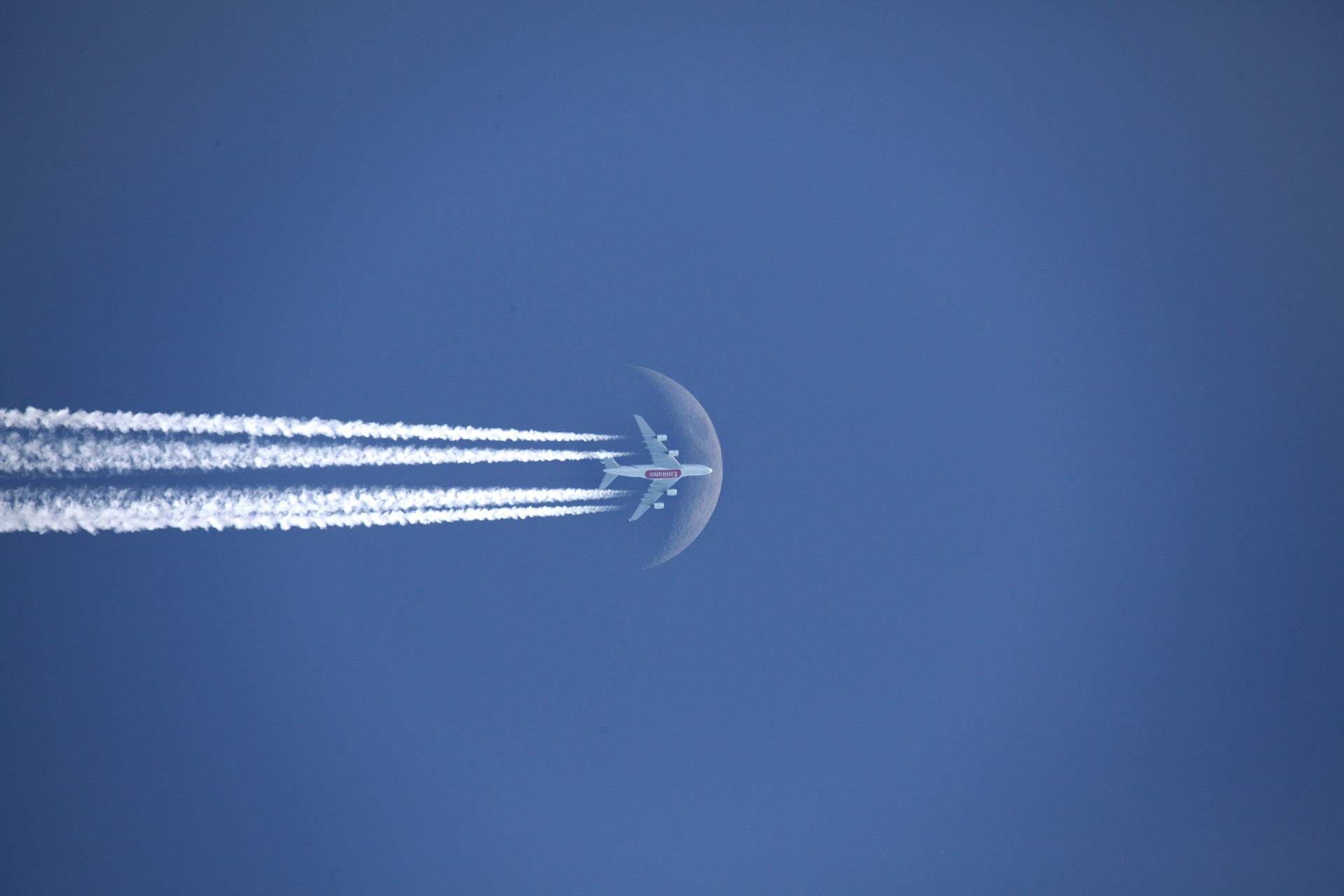 Mit dem Fotografieren von Vögeln wollte ich mich an diesem schönen Nachmittag beschäftigen. Es sind auch immer wieder Flugzeuge nahe am halb beleuchteten Mond vorbeigeflogen. Um 18 Uhr passte dann das dieses Flugzeug der Fluglinie "Emirates" ins Bild, das genau den Mond durchflog. Mit einer Serie habe ich dann diesen Moment genau erwischt, wo das Flugzeug den beleuchteten Mondrand berührte. Aufgenommen habe ich dieses Foto mit Canon 5D Mk II und Sigma 150 - 600 bei 600 mm und einer Belichtungszeit von 1/1000 Sekunde bei F10 und ISO 640.