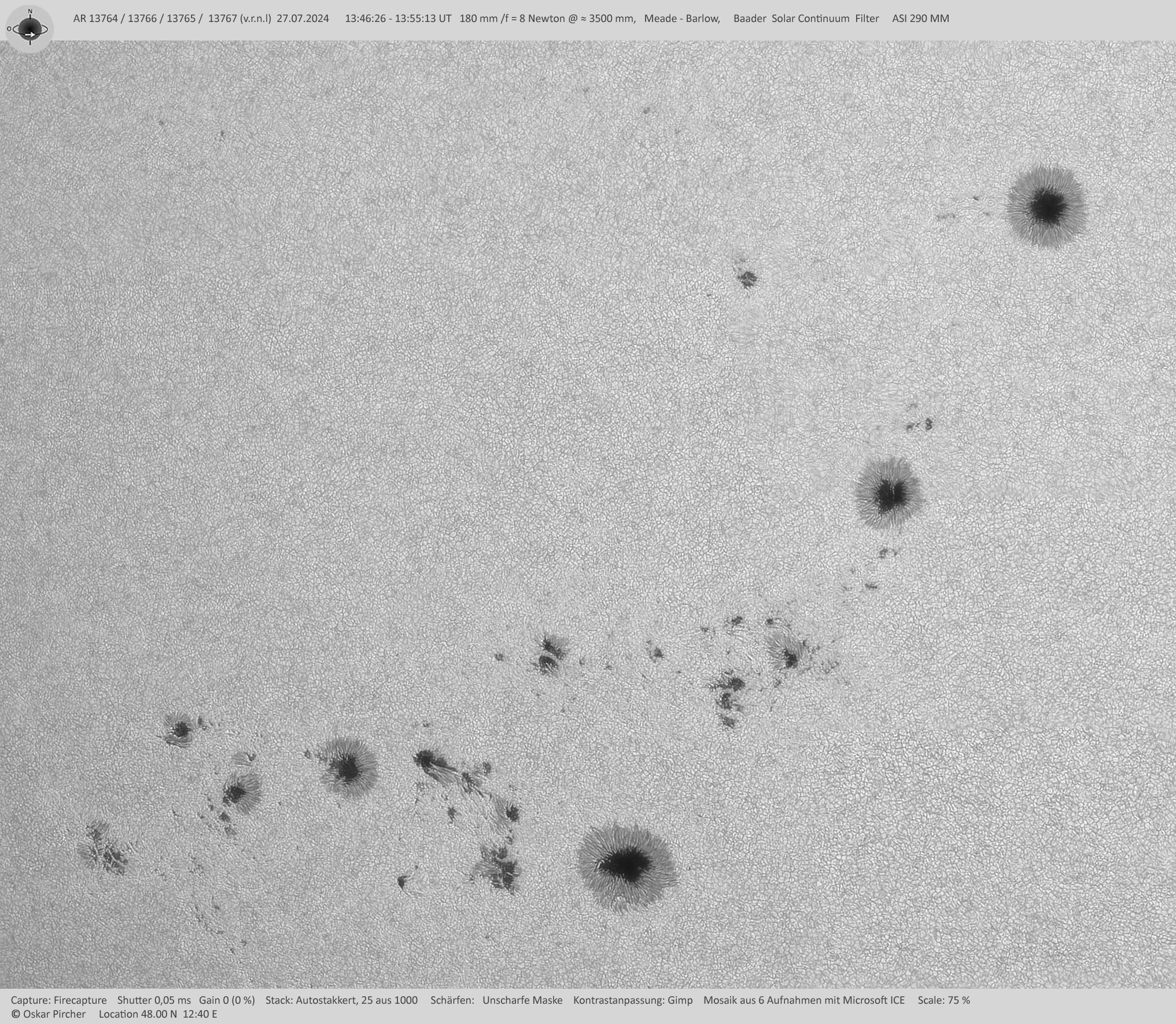 | Teleskop/Objektiv | 180 mm Newton, Baader Solar Continuum Filter |