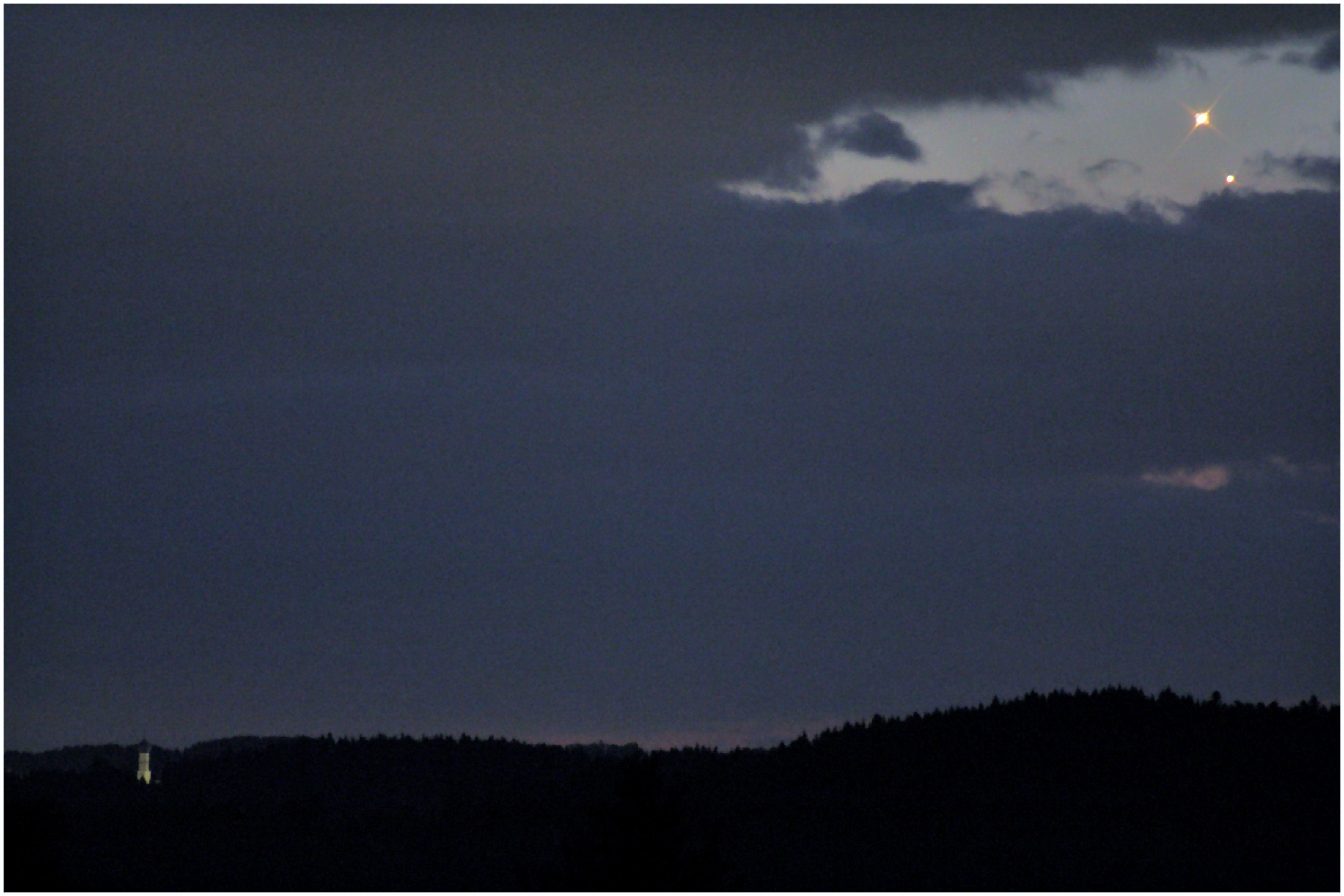Mein banges Hoffen auf eine Wolkenlücke, um die enge Konjunktion von Venus und Jupiter mit einem 300-mm-Objektiv zusammen mit der Kirche von Waakirchen abzulichten, erfüllte sich wortwörtlich in letzter Minute.