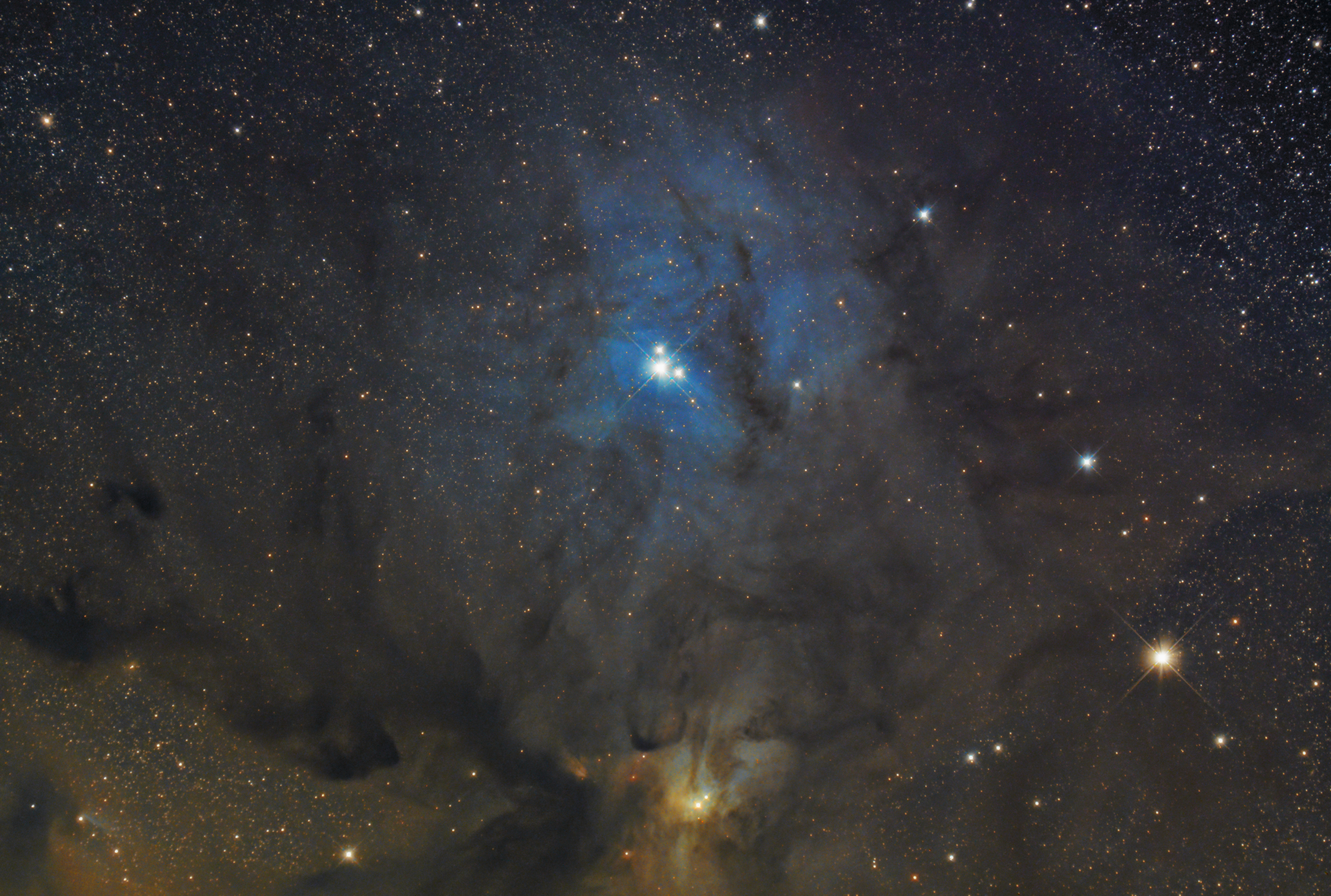 Der Rho-Ophiuchi-Nebel ist eigentlich eine Dunkelwolke im Sternbild Schlangenträger. Mit einer Entfernung von ungefähr 427 Lichtjahren ist dieses Gebiet eine der nächstgelegenen Sternentstehungsregionen. Wegen der südlichen Lage von -24° Deklination ist die Fotografie dieser Gegend wegen der oft herrschenden Luftunruhe am Horizont eine herausfordernde Sache.