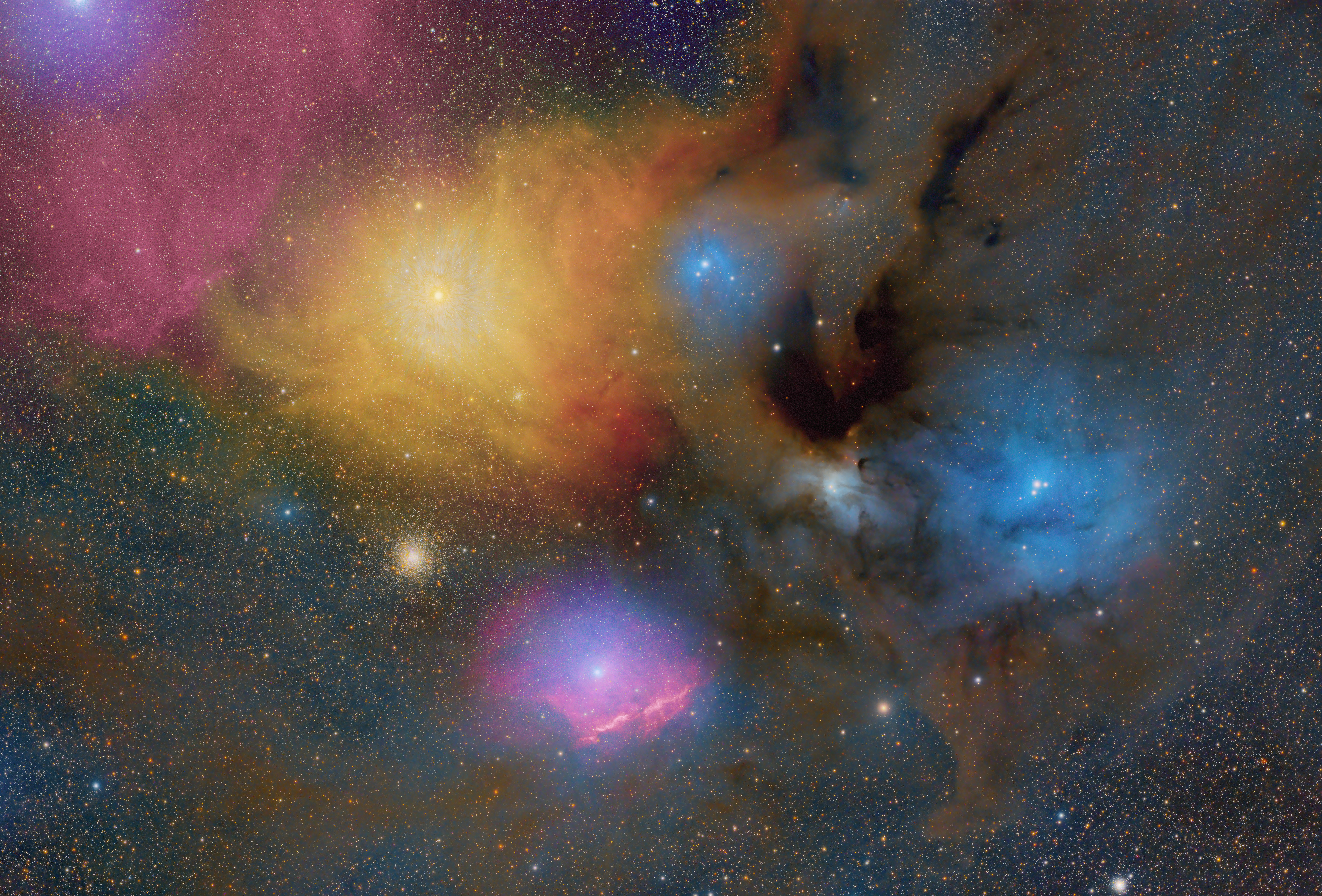 Kaum eine Region am Himmel ist so farbenfroh wie die Staub- und Wasserstoffwolken um den Stern Rho Ophiuchi. Neben Antares fallen auch die beiden Kugelsternhaufen M4 und NGC 6144 ins Auge.