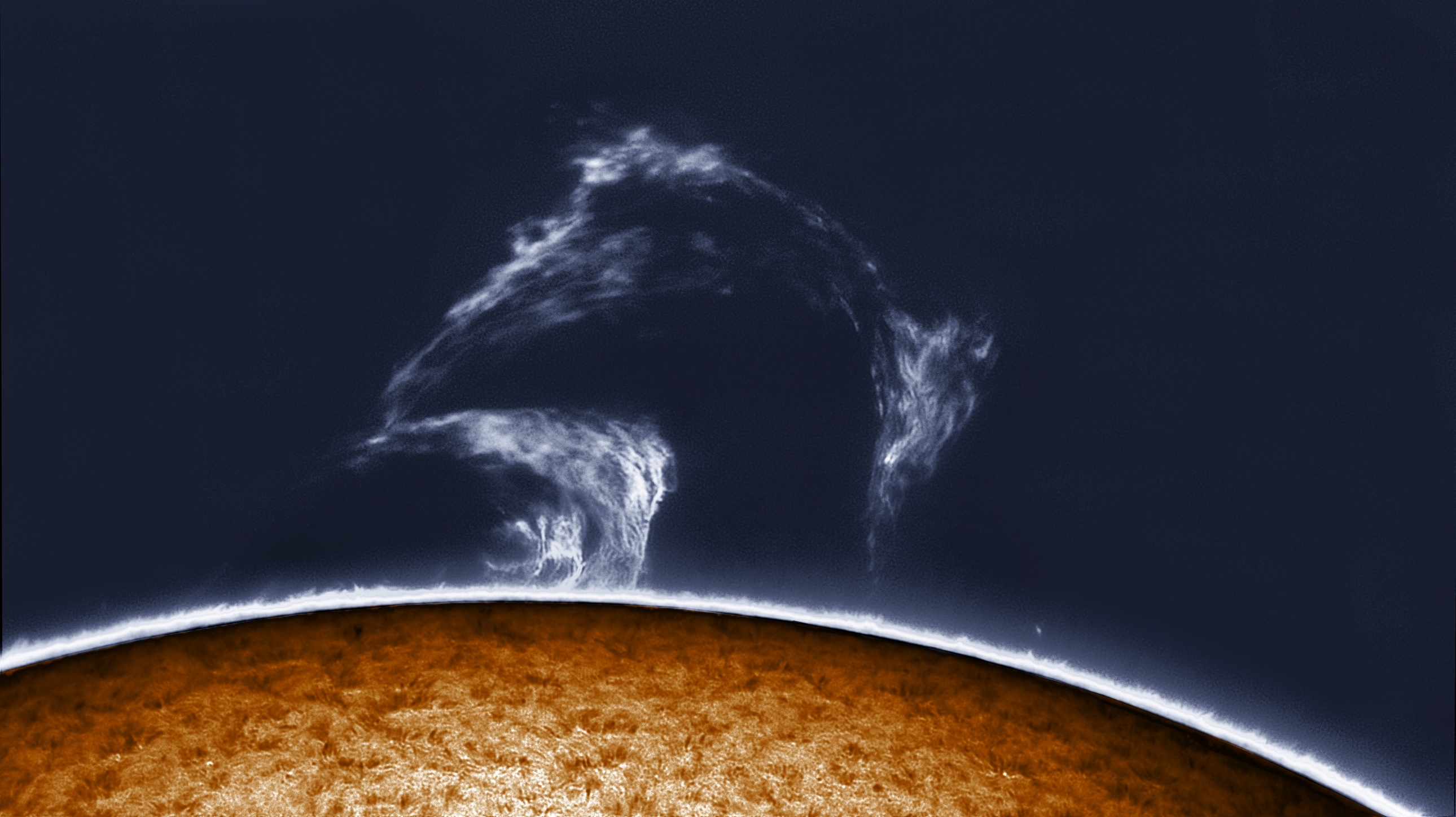 Eine besondere Protuberanz gab es Donnerstagmorgen zu sehen. Innerhalb von einer Stunde stieg sie in einem hohen Bogen hoch. Das kolorierte H-Alpha-Bild ist von 5:44 UT.