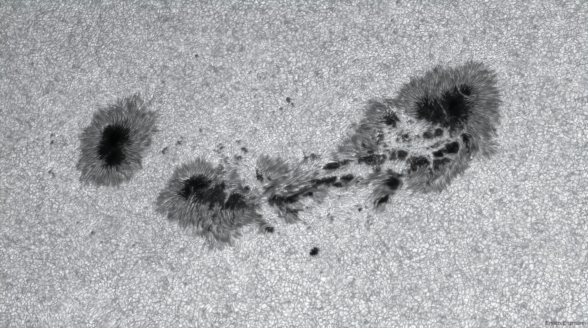Vor ein paar Tagen wollte ich die Fleckengruppe 3712 aufnehmen. Dabei ist mir ein Missgeschick passiert und ich hatte eine ähnliche große Gruppe, die auch länglich war, fälschlicherweise angefahren. Dieses Bild wurde vor ein paar Tagen hier veröffentlicht. Am 18. Juni 2024 hat es aber dann geklappt und ich konnte dieses Bild, das vielleicht mein bestes Sonnenbild im Weißlicht bisher ist, aufnehmen. Es zeigt sowohl in der Granulation sowie auch in den Flecken feine Details. Es wurde ein von mir mit einer Zwangskühlung modifizierter Herschel-Keil der Firma Baader sowie der neue Solar Continuum Filter verwendet, der nur noch 7,5 Nanometer Bandbreite hat.