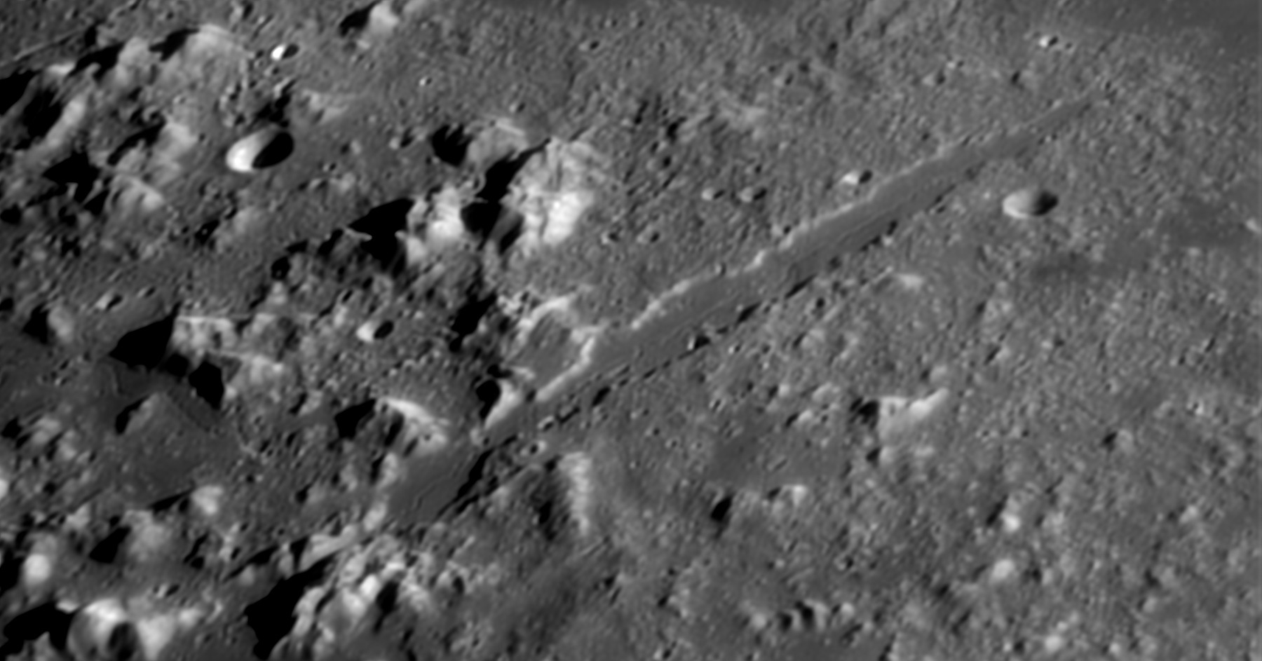 Diese Rille ist nur so 550 bis 580 Meter breit, 30 bis 80 Meter tief und zieht sich durch das gesamte Vallis Alpes. Aufnahme bei rund 10 Meter Brennweite bei guten bis durchschnittlichen atmosphärischen Bedingungen.