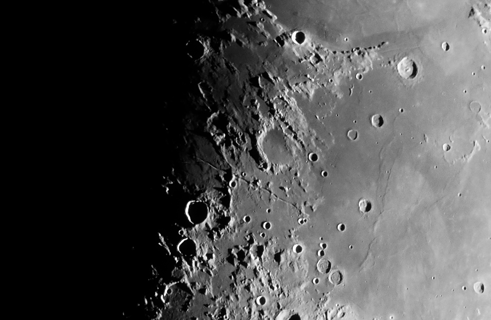 Die Rima Ariadaeus kann hier sehr schön bei flachem Lichteinfall an der Licht-Schattengrenze beobachtet werden. Es ist schon eine sehr große Rima, im Rükl-Mondatlas schon als »eher Tal« bezeichnet. In der rechten unteren Ecke sind die drei Krater Aldrin (3,4 km), Collins (2,4 km) und Armstrong (4,6 km) zu sehen, man erkennt schon den im rechten Kraterteil noch vorhandenen Schatten der Kraterwand. Wären es drei Hügel, dann befände sich der Schatten auf der linken Seite.