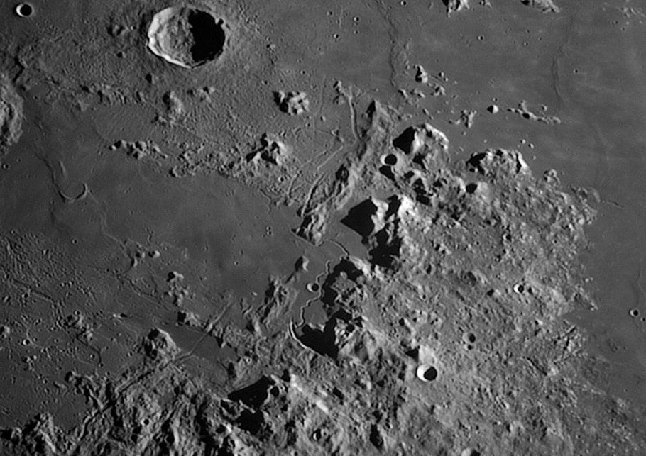 Die Gegend der Rima Hadley am Fuße des Mons Hadley Delta war Schauplatz der Landung der Apollo-15-Mission. Nördlich davon zu sehen ist das Geflecht der Rimae Fresnel.
