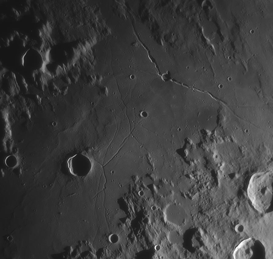 Als ich aufgrund der Wetteraussichten schon alle Hoffnungen schwinden sah, im zeitigen Frühjahr die große Höhe des Halbmondes über dem Horizont für Mondaufnahmen nutzen zu können, zeigte sich überraschenderweise zu Beginn der Dämmerung eine Lücke in der Wolkendecke, die ich kurzentschlossen nutzte. Bereits die erste Aufnahme bescherte mir die vollständige Darstellung der Rimae Triesnecker. Ein glückliches Zusammentreffen günstiger Umstände.