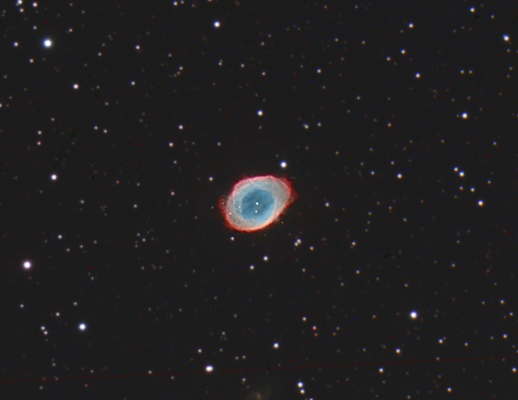 Der prägnanten Planetarische Nebel Messier 57 aus dem Sternbild Leier. Für diesen Crop wurden Luminanzaufnahmen aus dem Jahr 2012 mit Farbaufnahmen aus dem Mai 2020 kombiniert.