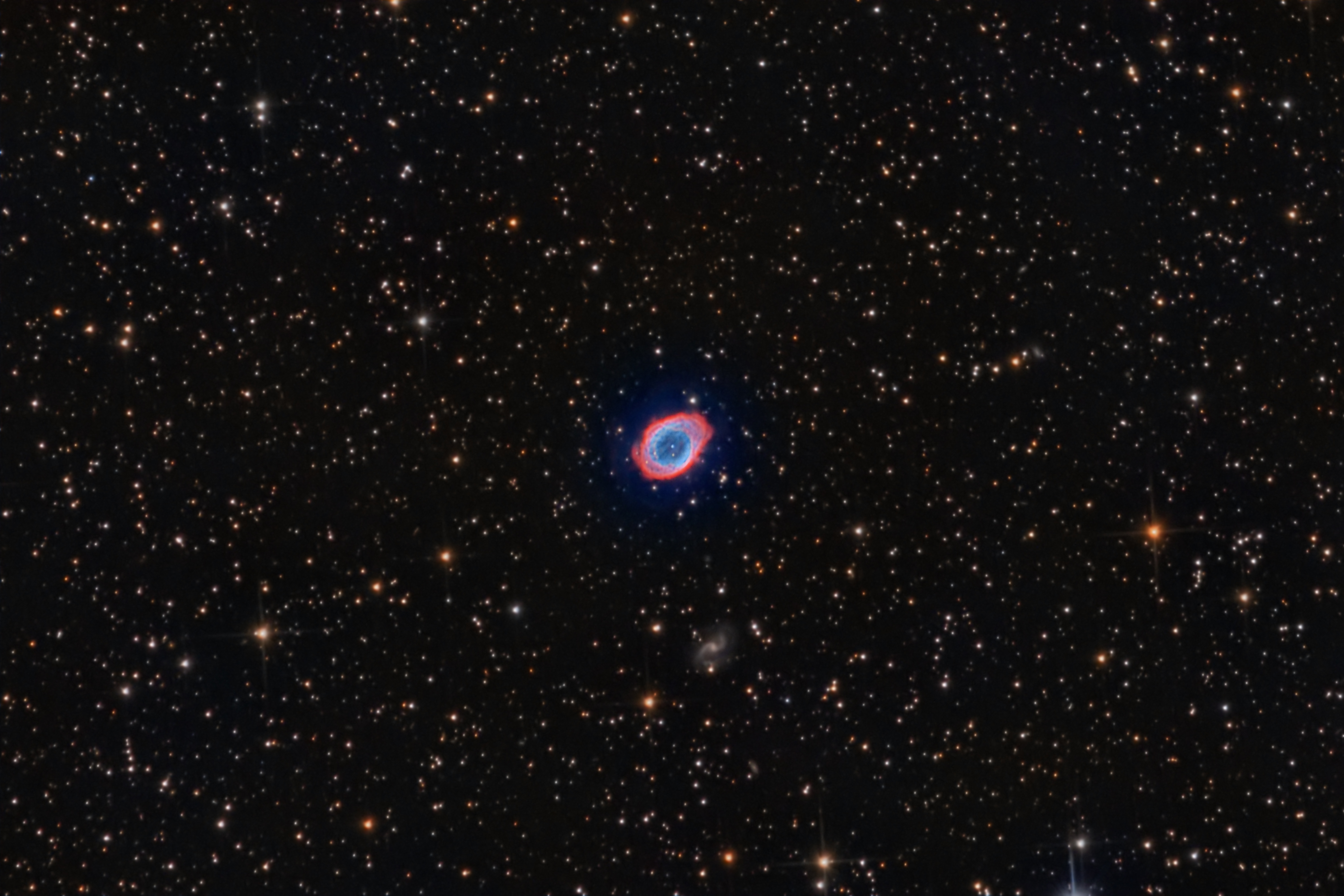 Den Ringnebel kann man selbst von lichtverschmutzten Orten aus recht gut beobachten, aber er ist winzig. Das macht es fotografisch zur Herausforderung, wenn man möglichst auch Details erkennbar machen möchte. Ich habe es mit vielen Einzelbildern und der so genannten Drizzle-Technik versucht.