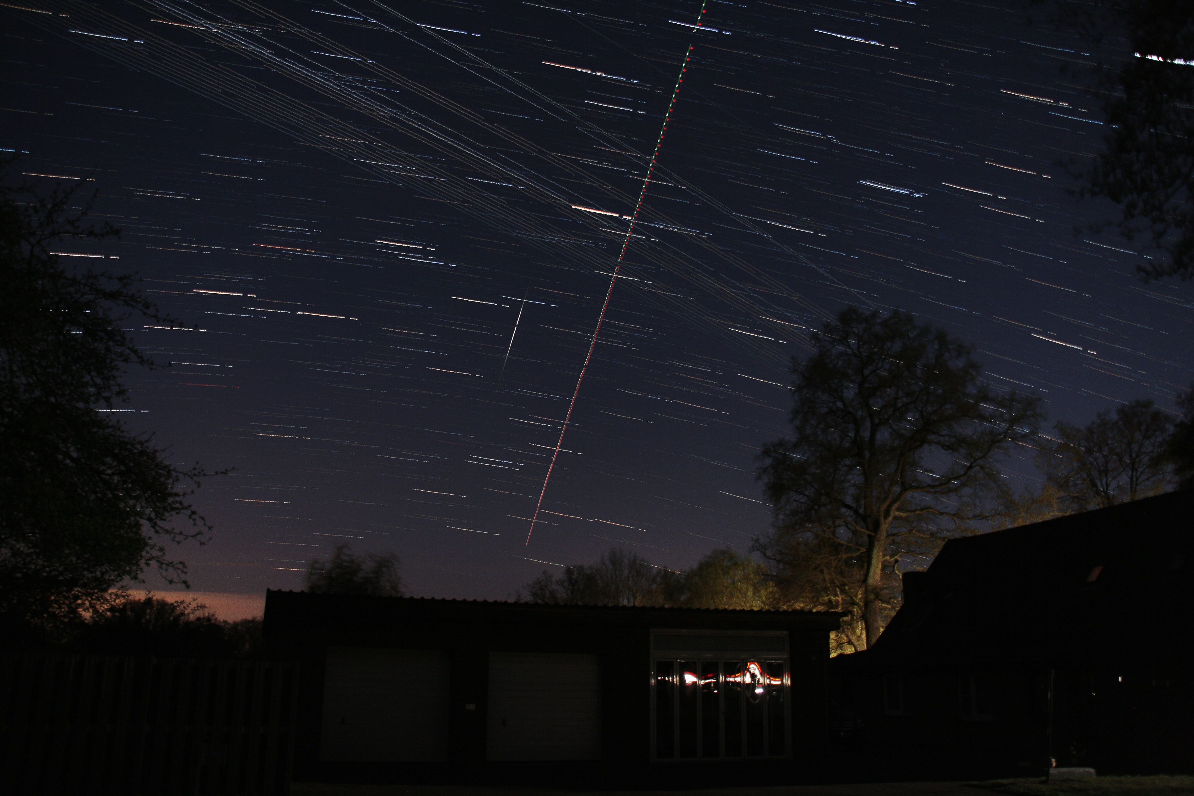 Am Abend des 18. April 2020 zogen wieder helle Satelliten im Formationsflug über den Himmel. Sie erreichten die Helligkeit von Regulus (!), 23 von ihnen gingen mir ins Netz, bevor der "Nachschub" nach einer kurzen Unterbrechung endete. Wegen der versetzten Umlaufbahnen entstand im Maximum-Helligkeits-Komposit der Eindruck eines Rings um die Erde.