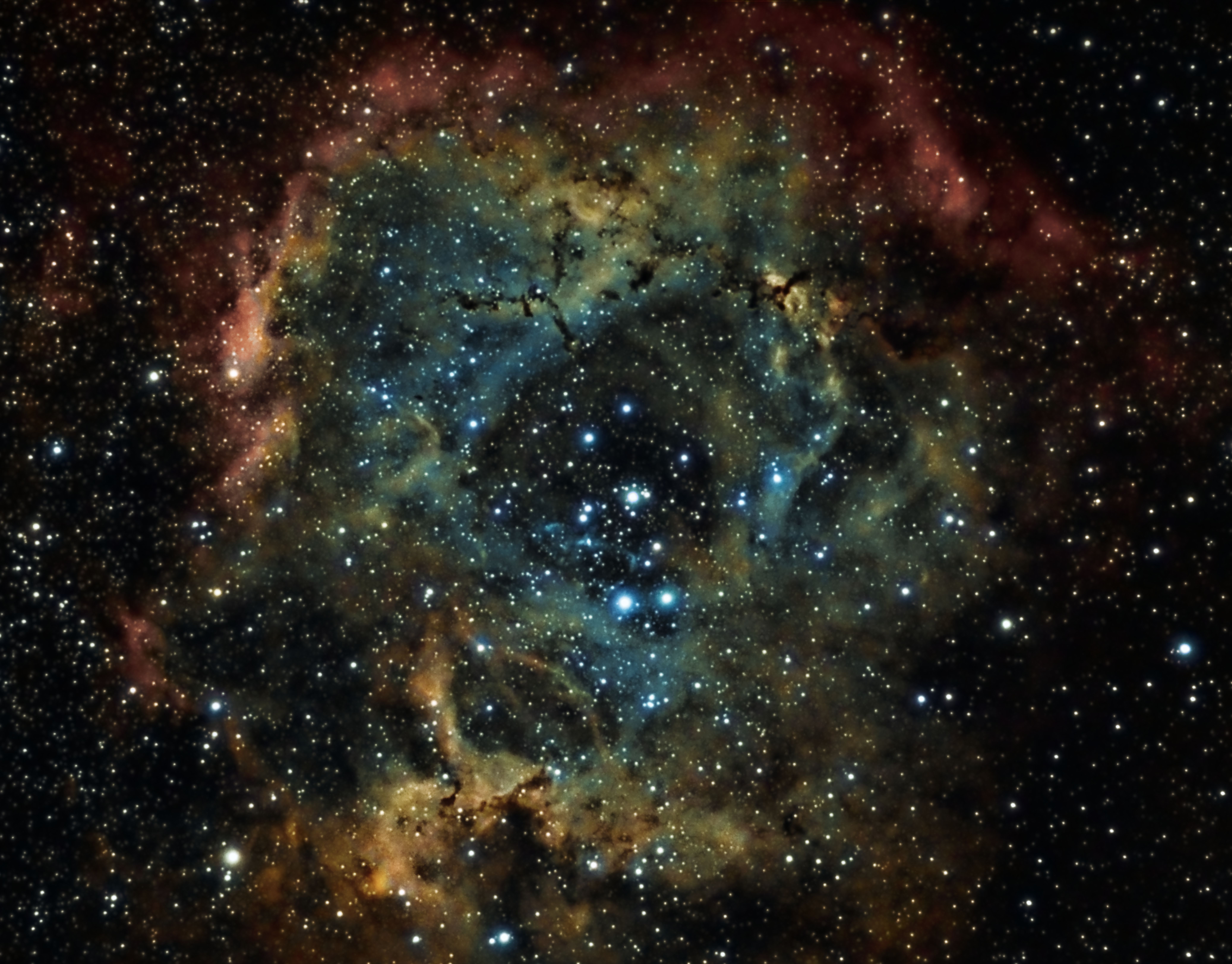 Hier im Bild ist der Rosetten-Nebel und der Sternhaufen NGC 2244 zu sehen. Er gehört mit zu den schönsten galaktischen Nebeln des Himmels, die auch schon mit dem Fernglas gut zu sehen sind. Diese Aufnahme entstand im Februar 2019 und wurde mit einem Großfeld - Achromat gemacht. Filter war ein IDAS LPS - D1. In der Endbearbeitung wurde die SHO - Technik mit Farbverstärkung angewandt.