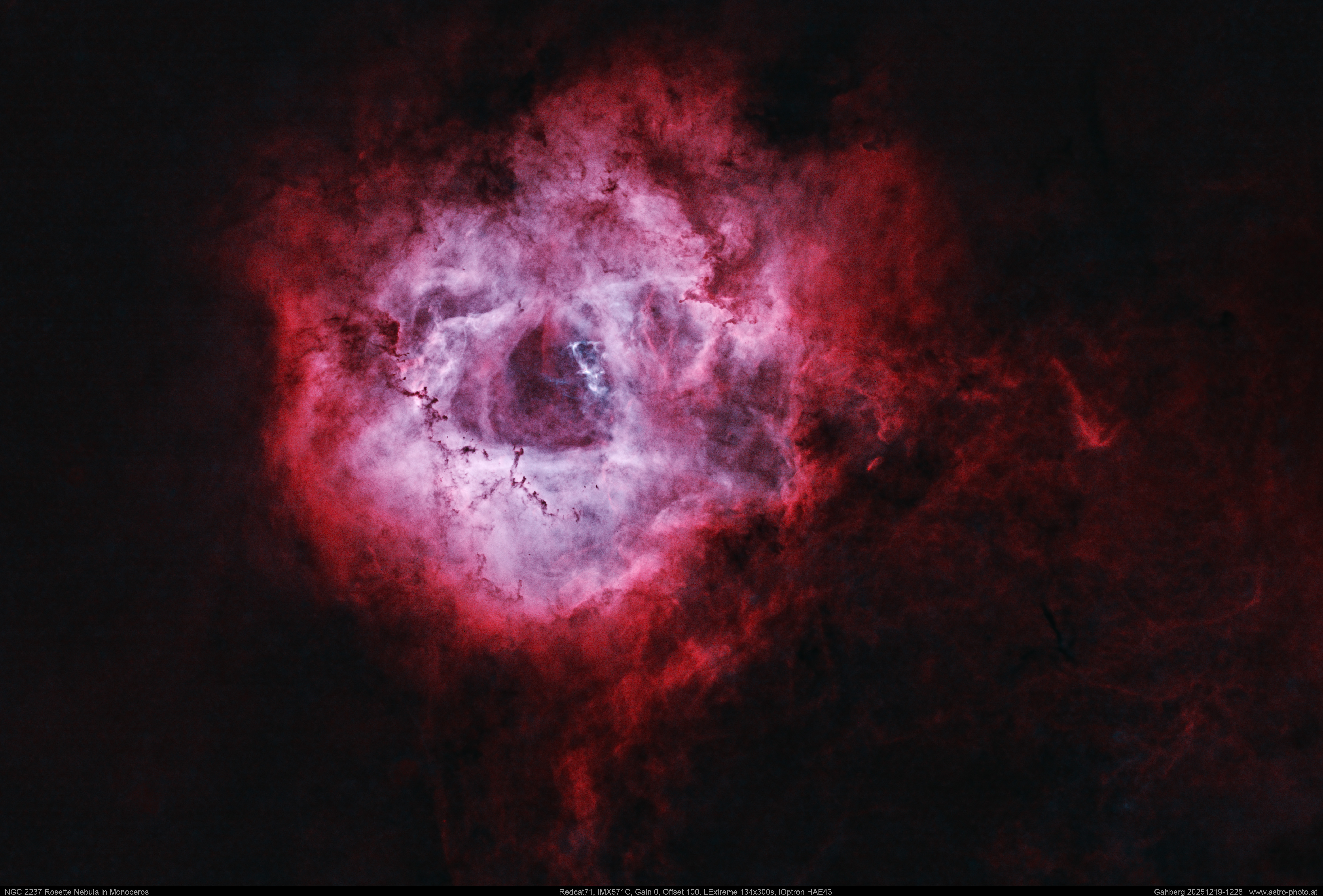 Bei dieser Aufnahme wurden die Sterne mit der Software StarXterminator in Pixinsight entfernt. So kommt der berühmte Rosettennebel voll zur Geltung.