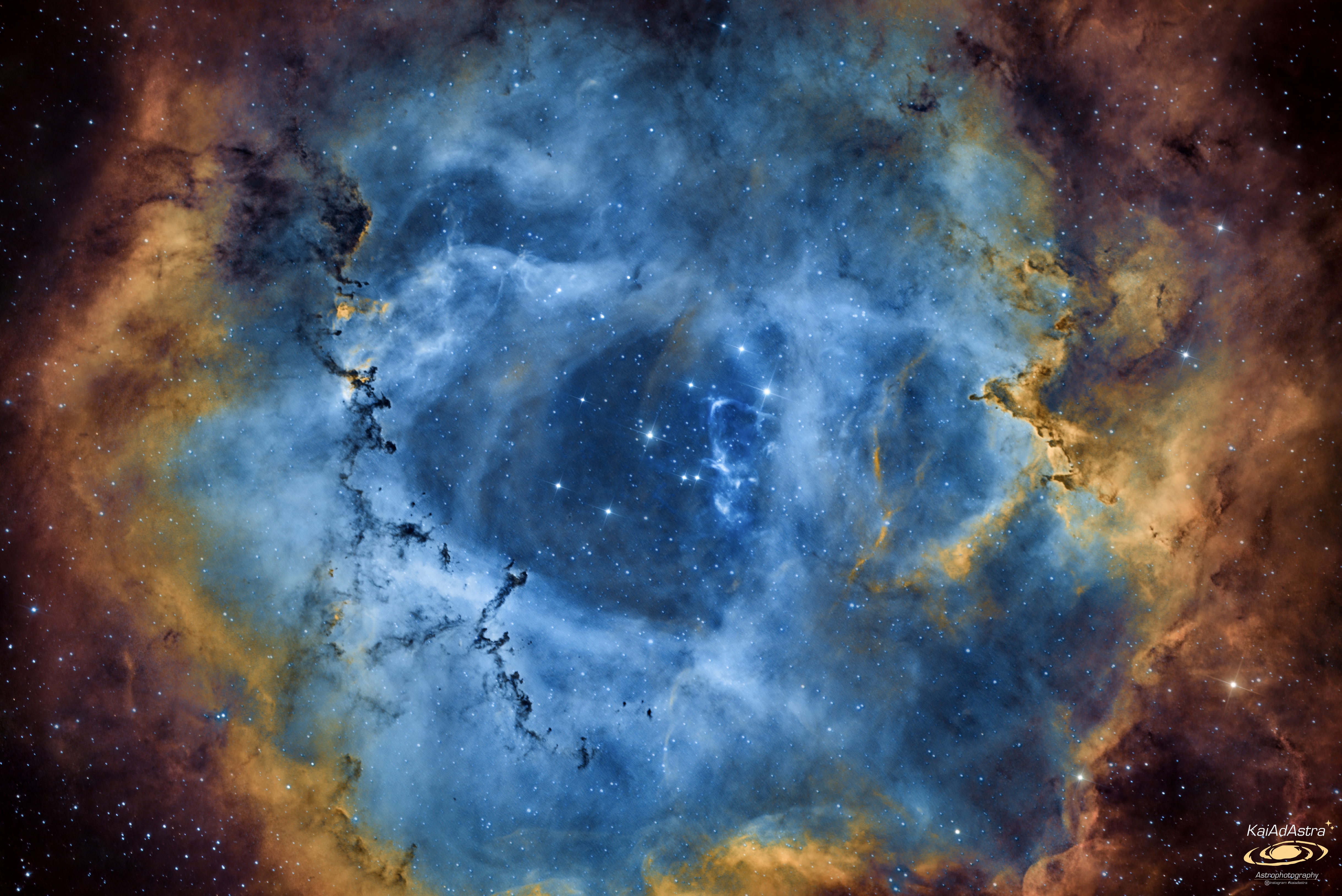 Der Rosettennebel ist ein diffuser Emissionsnebel mit eingebettetem offenen Sternhaufen im Sternbild Einhorn. Aufgenommen mit einem Duo-Narrowband-Filter und als HOO entwickelt.