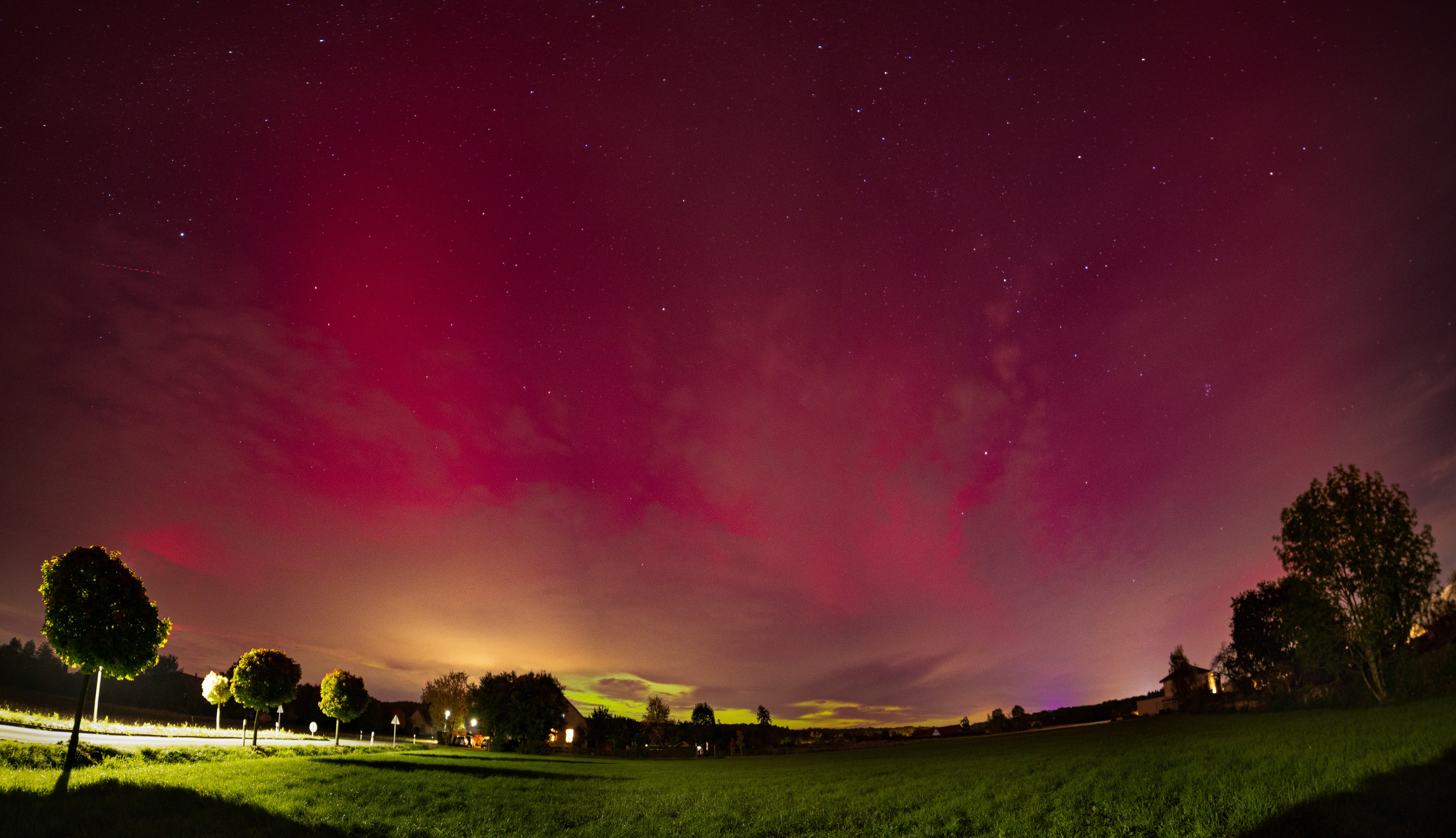 Ein weiter Blick über eine nächtliche Landschaft, in der sich ein tiefroter Himmel wie ein leuchtender Schleier über Felder und Bäume spannt. Feine Sterne durchbrechen die farbigen Wolken, während am Horizont ein sanftes, grünlich-gelbes Leuchten erscheint. Das Zusammenspiel von künstlichem Licht und nächtlicher Atmosphäre verleiht der Szene eine beinahe surreale, ruhige Stimmung.