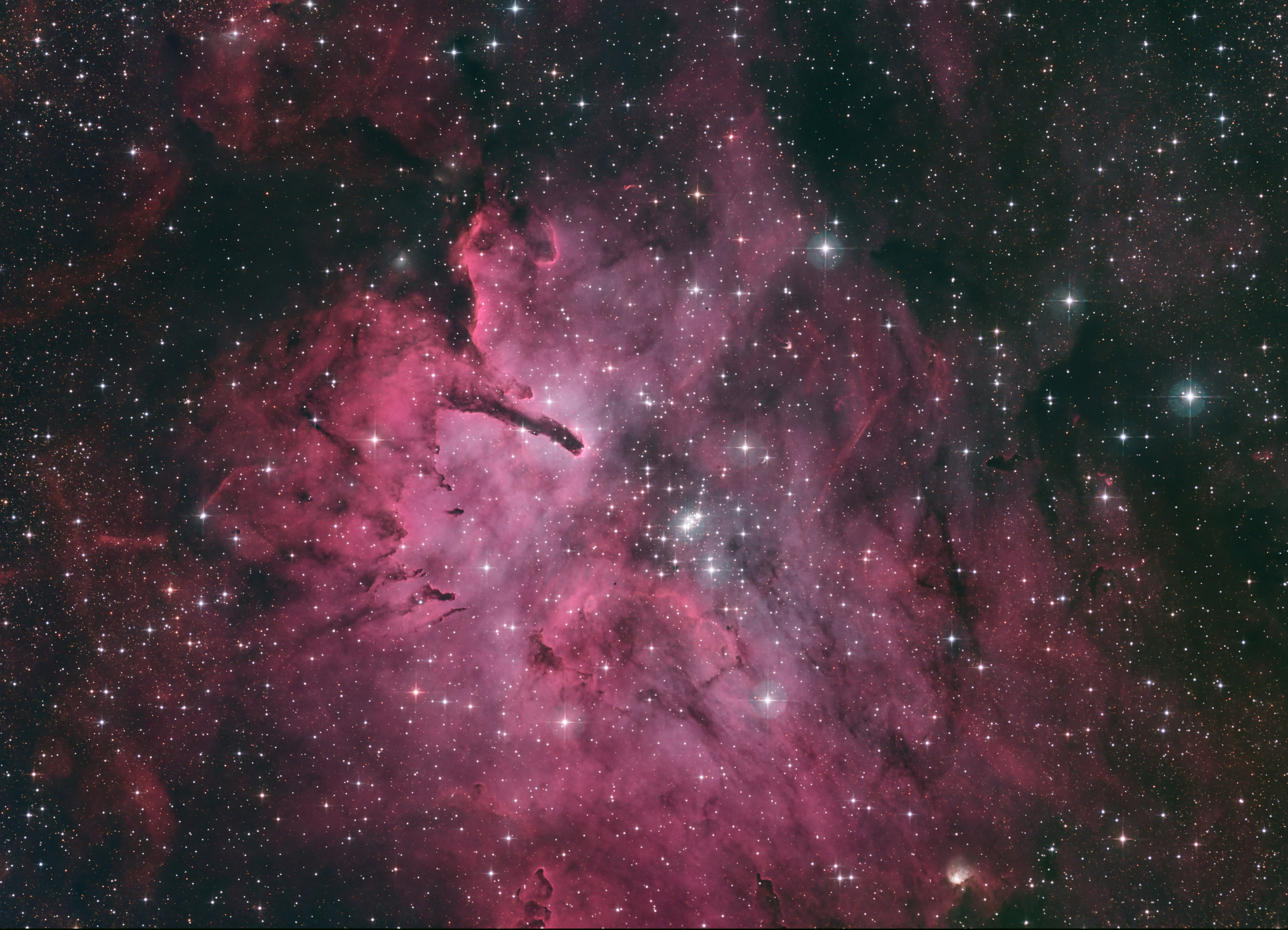 Der Nebel NGC 6820 in seiner weitläufigen Umgebung ist ein klassisches Aufnahmegebiet der Wasserstoff (H)-Emission. Neben H-Alpha gibt es auch H-Beta und weitere H-Linien, welche im blauen bis violetten Farbbereich angesiedelt sind. Leider haben die meisten Filterräder zu wenig Platz für ein zusätzliches H-Beta-Schmalbandfilter. Um die farbliche Differenzierung der H-Bereiche doch näherungsweise darzustellen, bietet sich an einen Teil der H-Alpha-Daten auch dem Blau-Kanal zuzuordnen.