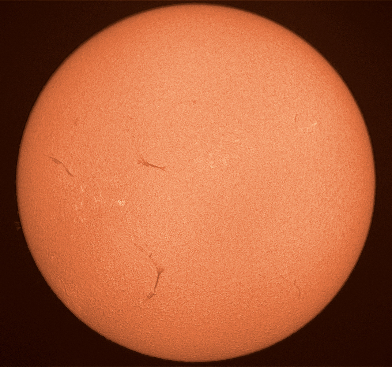 Sehr ruhig geht es derzeit auf der Sonne zu. Kaum Flecken, kaum Protuberanzen, nur einige Filamente.