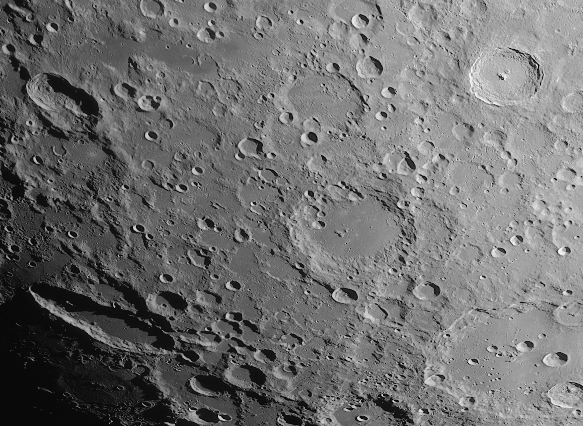 Mosaik aus vier Bildteilen mit der Gegend um den Krater Longomontanus. Tyche rechts oben gleißt bereits in hellem Sonnenlicht, während am linken Bildrand die Krater Hainzel und Schiller gerade Sonnenaufgang erleben.