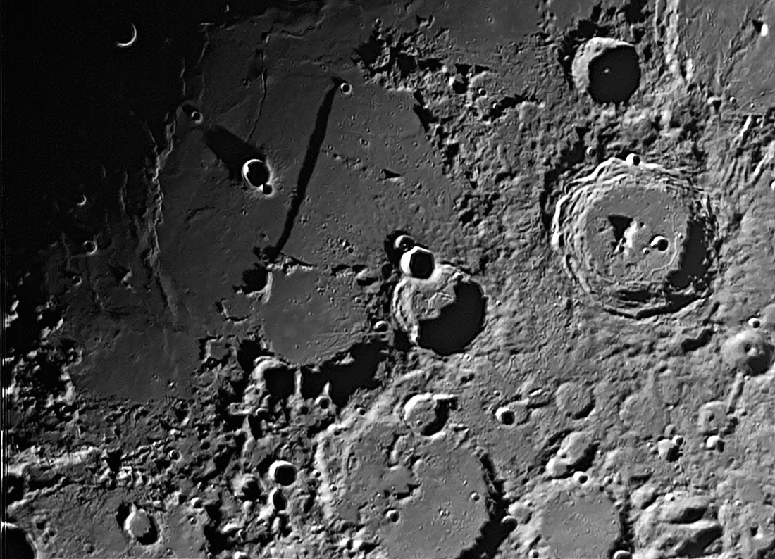 Der Schattenwurf für die lange Wand und dem angrenzenden Krater Birt (mit Rille) war ideal. Auch kann man nachvollziehen, dass der englische Mondbeobachter Simon Kid, Birt und Birt A als Käfer assoziierte :-) Das Auswurfmaterial ist ziemlich hell und ist bei Vollmond strahlenförmig zu sehen. Bei abnehmendem Mond ist Rupes Recta als "Huygens Schwert" besser zu erkennen, weil der Hang dann hell beleuchtet ist.