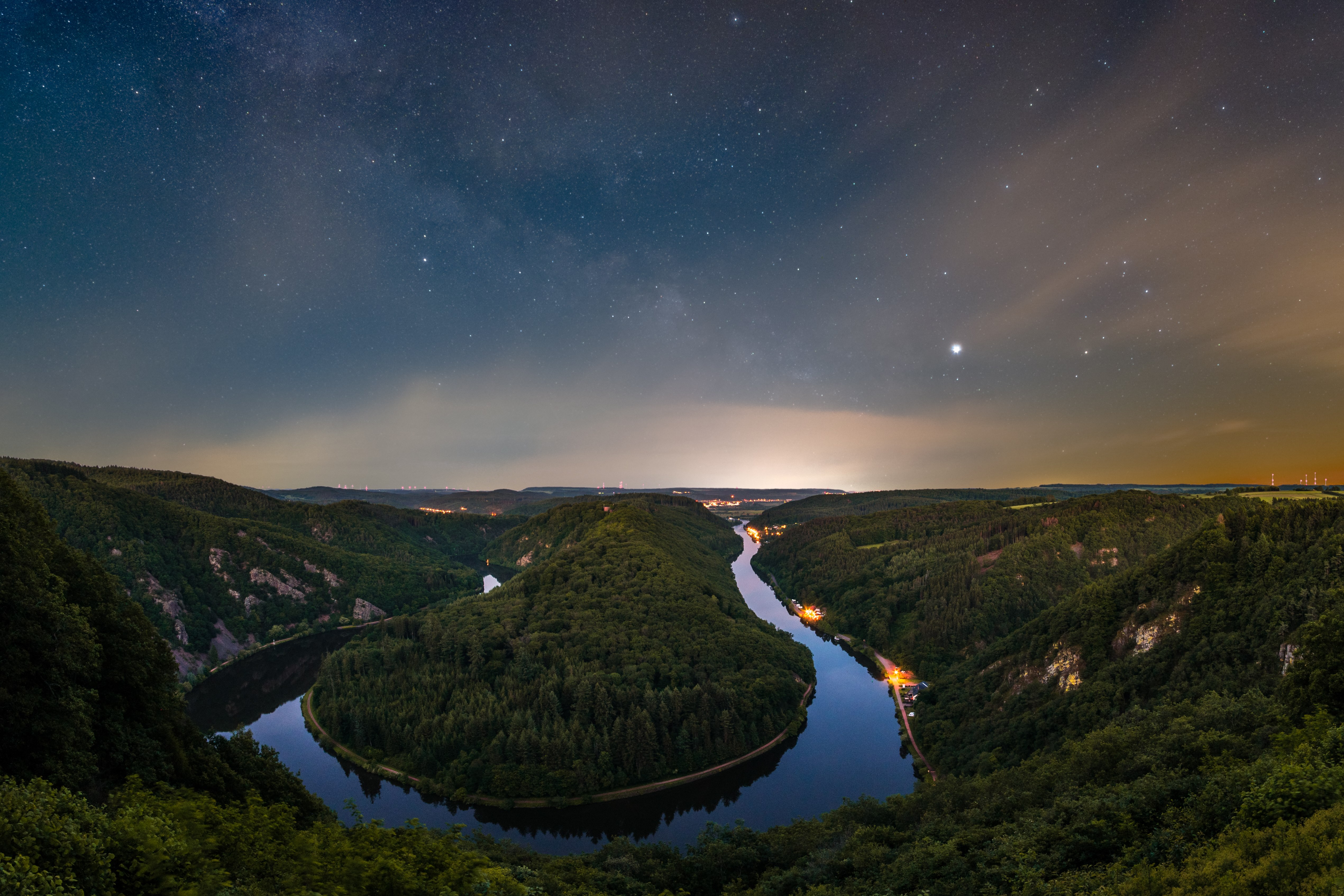Der Nachthimmel über der Saarschleife. Trotz Bewölkung sind einige astronomische Objekte zu sehen: Das Band der Milchstraße links oben im Bild sowie das Sternbild Skorpion rechts im Bild. Das am hellsten erscheinende Objekt ist der Planet Jupiter. Im Hintergrund sehen wir die in Deutschland allgegenwärtige Lichtverschmutzung. Die Saarschleife bietet eine sehr schöne Kulisse für das Gesamtbild. Zuerst habe ich während der blauen Stunde die Landschaft aufgenommen. Nach Einbruch der Dunkelheit habe ich dann mit Nachführung den Sternenhimmel fotografiert.