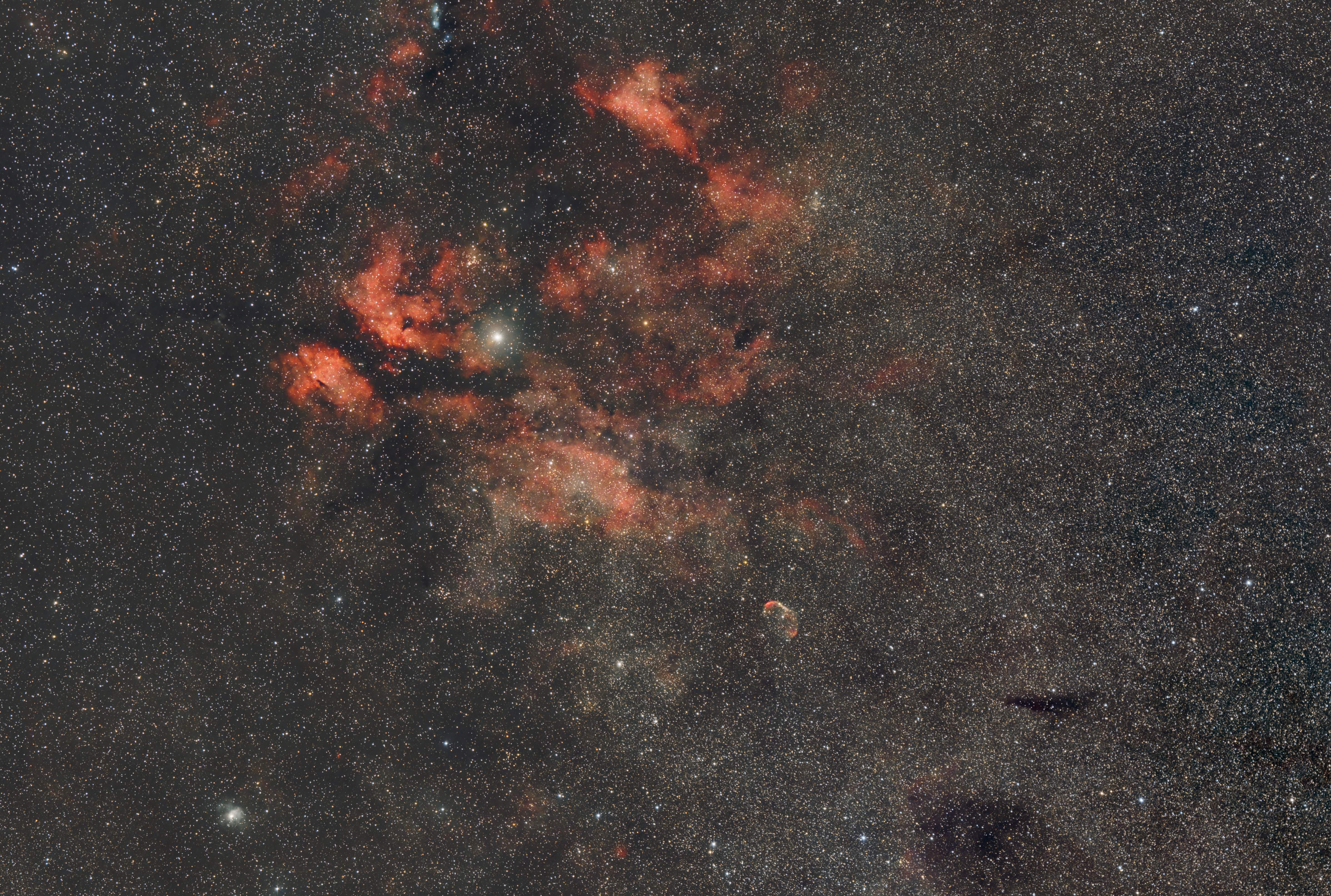 In diesem Bereich des Himmels gibt es viel zu entdecken! Um nur ein paar der hier sichtbaren Objekte aufzulisten: IC 1318A und B, NGC 6888, LBN 218, LDN 862 und Barnard 145. Somit haben wir es mit Objekten vieler verschiedener Klassen zu tun, die auch in unterschiedlichen Katalogen gelistet sind. Emissionsnebel, Reflexionsnebel und Dunkelnebel - alles da. Im Sternbild Schwan kann man sich definitiv mit allen erdenklichen Optik-Kamera-Kombinationen herrlich austoben.
