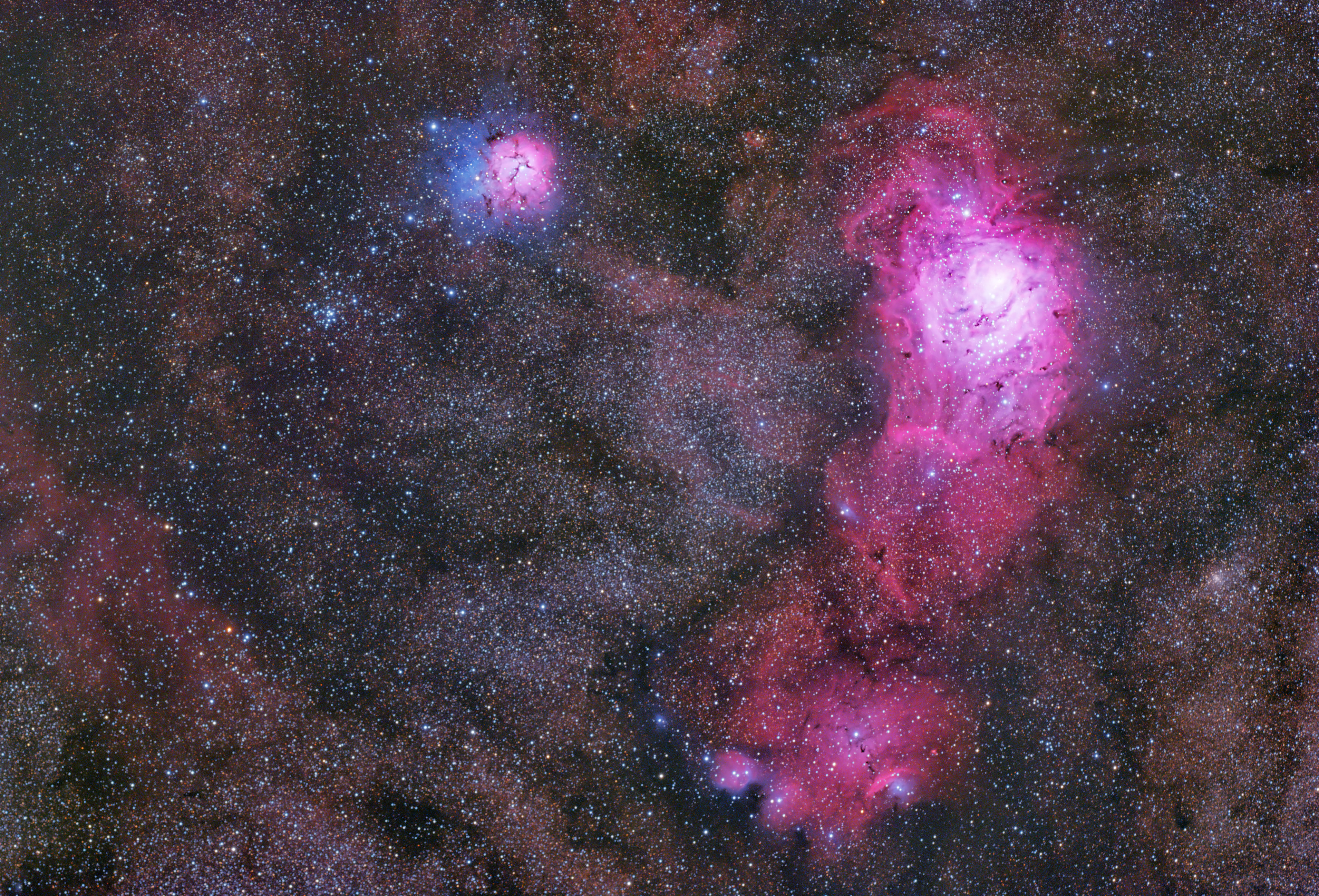 In dem an Deep-Sky-Objekten reichen Sternbild Sagittarius (Schütze) befindet sich eine herrliche dreiecksförmige Anordnung von drei herausragenden Emissionsnebeln, die in diesem Bild dargestellt sind. Rechts vom Bildzentrum sieht man den berühmten Lagunen Nebel, der sich bis zu dem schwachen und weniger bekannten Psychedelischen Nebel (IC 4685) erstreckt. Das dritte Mitglied in diesem Triplett ist der phantastische Trifid-Nebel links oben im Bild. Aber es gibt noch mehr zu sehen: Links unterhalb des Trifid-Nebels befindet sich M21, ein heller offener Sternhaufen aus der Messierliste, und am rechten Rand des Bildes findet man den Kugelsternhaufen NGC 6544.