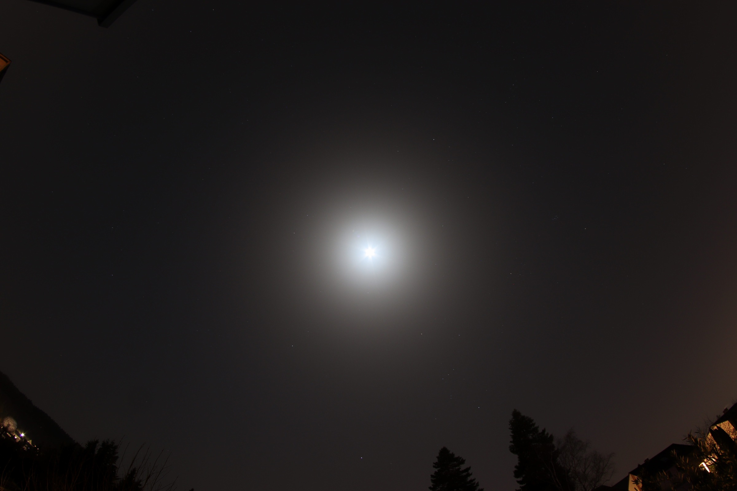 In der Nacht vom 22. Februar 2021 beeinträchtigte Saharastaub die astronomische Beobachtung über Rheinland-Pfalz und dem Saarland. Wie durch einen Nebelschleier präsentierte sich der Mond mit einem riesigen Halo. Mit bloßem Auge erkannte man gerade die hellsten Sterne des Wintersechseck. Selbst Orion ist nur sehr schwer auszumachen. Er befindet sich auf dieser Aufnahme rechts unterhalb des Mondes.