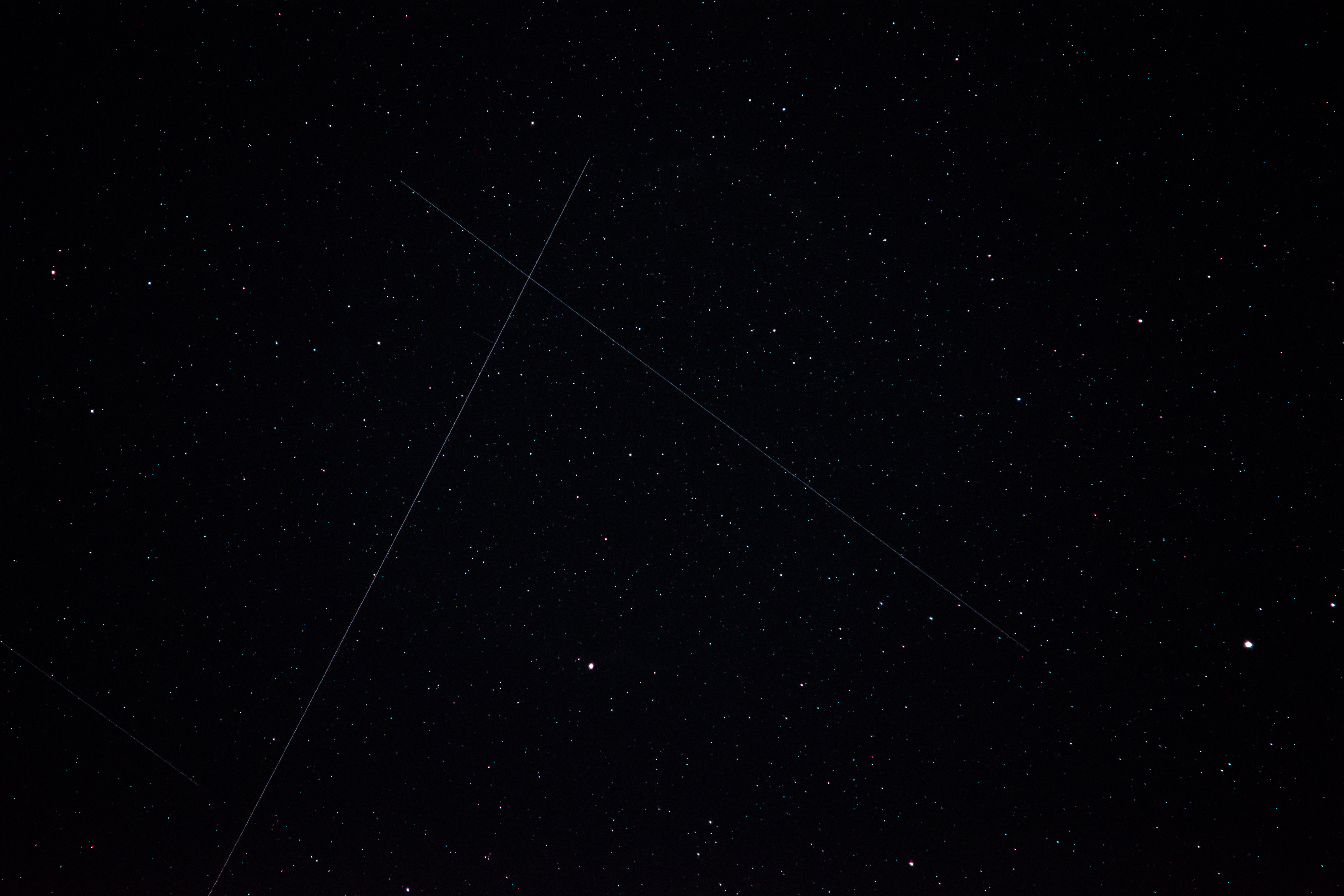 Durch Zufall gelang mir während einer Aufnahme des Zirrusnebels ein Foto mit gleich vier Satellitenspuren, die zudem noch fast rechtwinklig zueinander angeordnet sind.