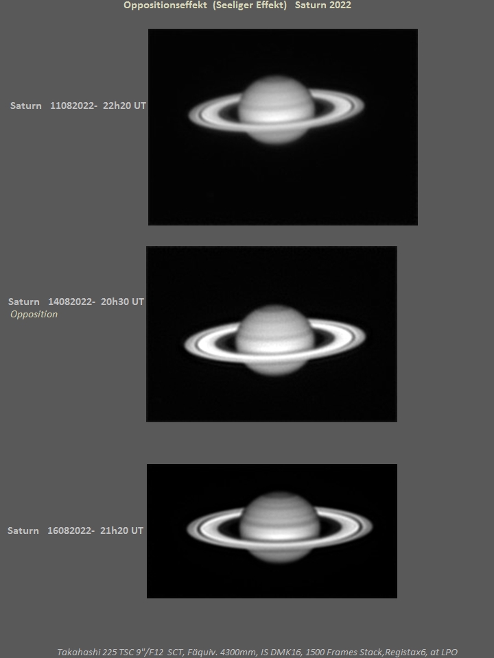 Aufgrund der guten Wetterbedingungen um Mitte August (und gerade am Oppositionstag des Saturn!) konnte ich einen lange gehegten Plan zur Zufriedenheit ausführen, nämlich den Nachweis des Oppositionseffektes (Seeliger Effekt), (Hugo von Seeliger(1849-1924), Direktor der Sternwarte München-Bogenhausen, Lehrer von Karl Schwarzschild, bedeutender deutscher Astronom). Die heurige Saturn-Opposition trat am 14. August 16h UT ein. Die Entfernung betrug dabei 1330000000 km. Nur fünf Stunden später konnte die Oppositionsaufnahme gewonnen werden, zwei Tage davor und danach die Kontrollaufnahmen Die Relativgeschwindigkeit (Überholen der Erde) betrug dabei 29.8 - 9.7 = 21 km/sec,das entspricht in den zwei Tagen einer Strecke von 21 x 2 x 86400 = 3630000 km, das entspricht 13 Saturnringdurchmessern (= 9 Bogenminuten) am Himmel. Innerhalb dieses Zeitraumes spielt sich der Oppositionseffekt ab. Auf der Peripherie eines Kreises mit 1330 mm Radius (Maßstab 1: 1 Milliarde) beträgt diese Strecke (in vier Tagen) nur 7 mm! Der Oppositionseffekt ist also ein sehr kurzzeitiges Phänomen mit einem spitzen kurzen Maximum!